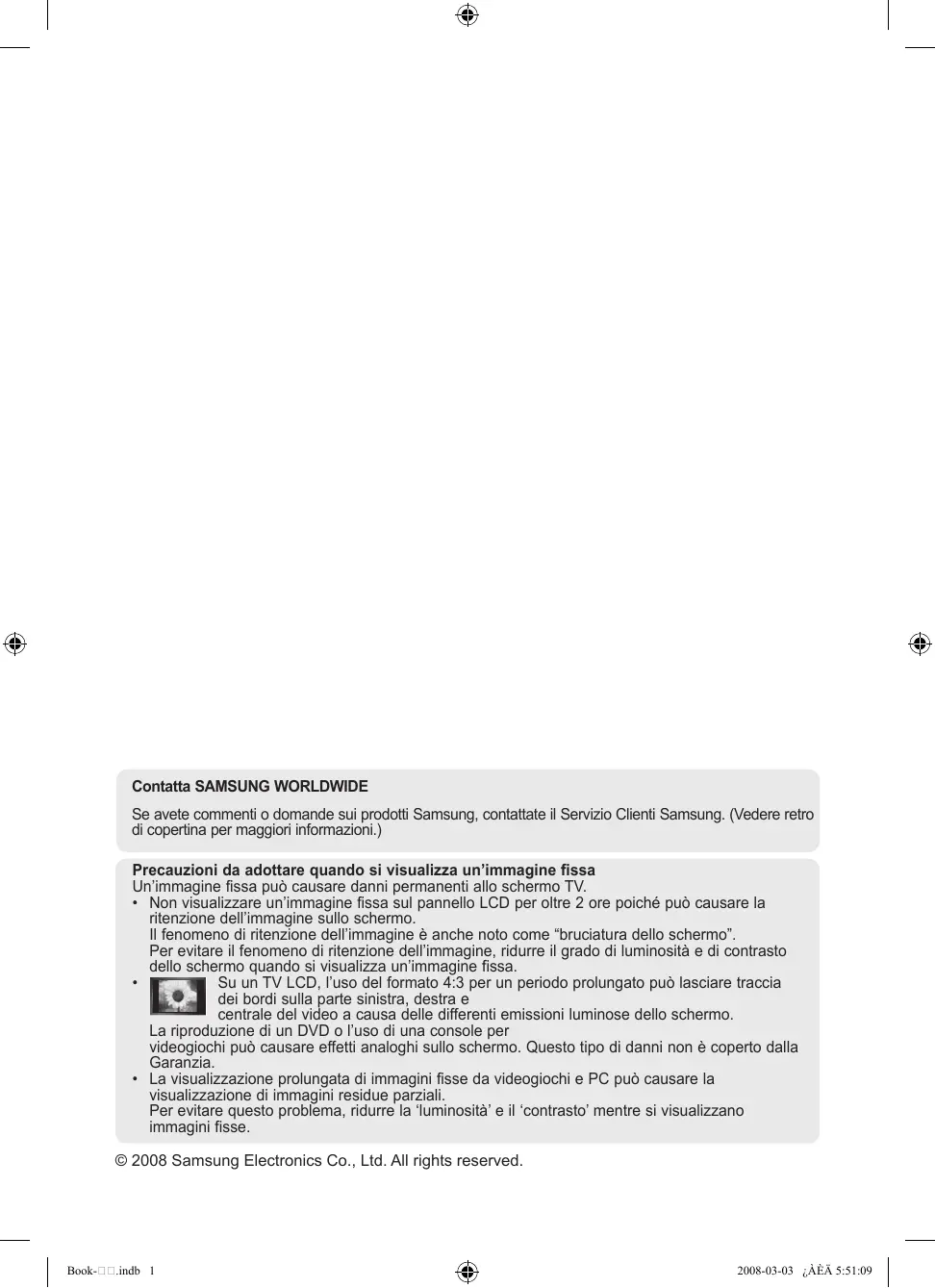- La visualizzazione prolungata di immagini fisse da videogiochi e PC può causare la visualizzazione di immagini residue parziali. Per evitare questo problema, ridurre la ‘luminosità’ e il ‘contrasto’ mentre si visualizzano immagini fisse. © 2008 Samsung Electronics Co., Ltd. All rights reserved. Book-.indb 1 2008-03-03 ¿ÀÈÄ 5:51:09 Contenuto