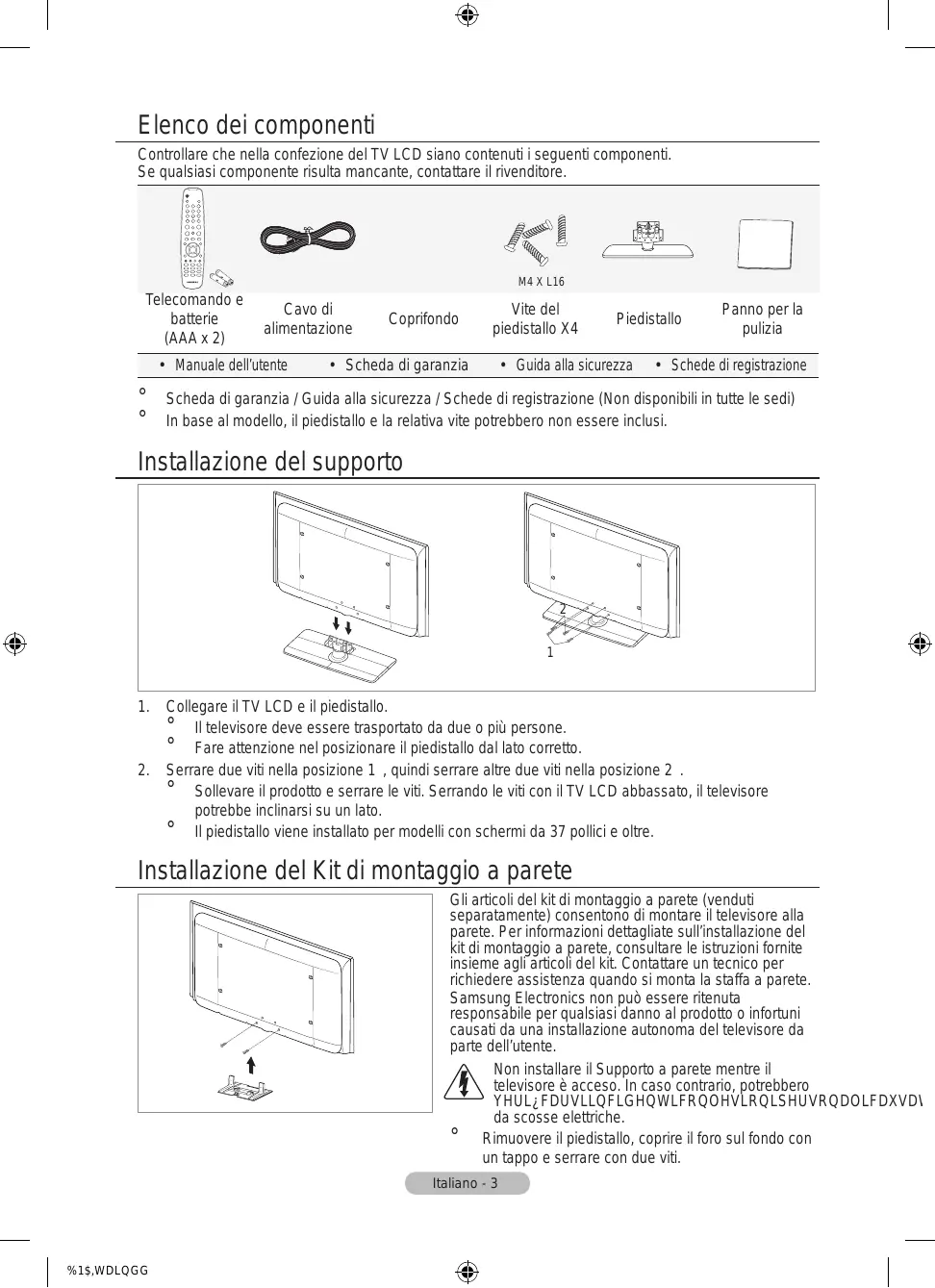 - ‹ Controlli da effettuare prima di contattare l’assistenza tecnica Questo apparecchio è fabbricato in conformità al D.M.28.08.95 n.548 ed in particolare a quanto specificato nell Art.2, comma 1. Questo apparecchio è fabbricato nella U.E. in conformità al D.M.28.08.95 n.548 Art.2, comma 1 ed al D.M.26.03.92 Art.1 Simboli Premere Nota Italiano - 2 BN68-01409A-00Ita-0221.indd 2 Tasto One-Touch Elenco dei componenti Controllare che nella confezione del TV LCD siano contenuti i seguenti componenti. Se qualsiasi componente risulta mancante, contattare il rivenditore. M4 X L16 Telecomando e batterie (AAA x 2) Cavo di alimentazione p. 60