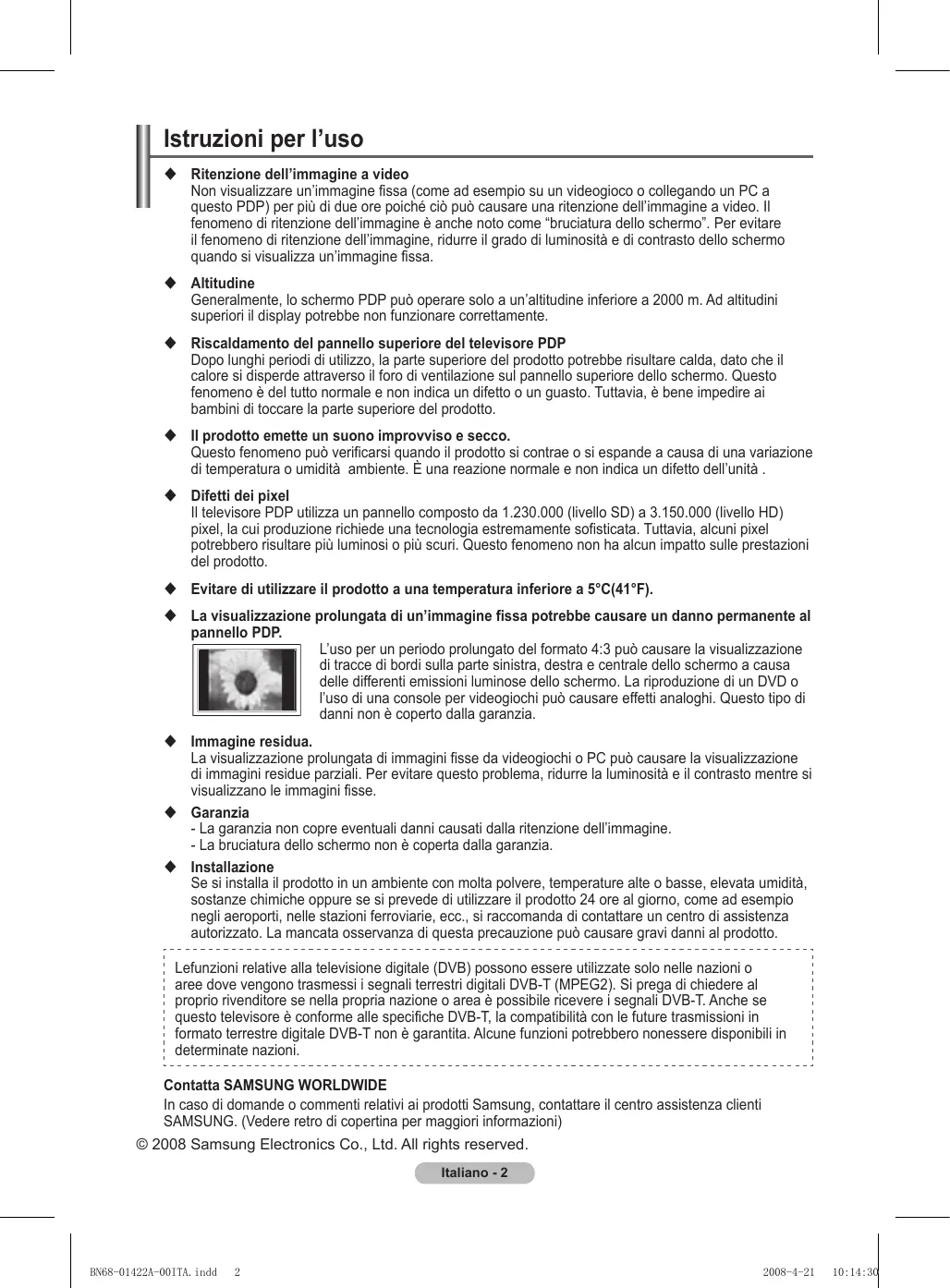 2008-4-21 11:06:07 Istruzioni per l’uso Ritenzione dell’immagine a video Non visualizzare un’immagine fissa (come ad esempio su un videogioco o collegando un PC a questo PDP) per più di due ore poiché ciò può causare una ritenzione dell’immagine a video. Il fenomeno di ritenzione dell’immagine è anche noto come “bruciatura dello schermo”. Per evitare il fenomeno di ritenzione dell’immagine, ridurre il grado di luminosità e di contrasto dello schermo quando si visualizza un’immagine fissa. Altitudine Generalmente, lo schermo PDP può operare solo a un’altitudine inferiore a 2000 m. Ad altitudini superiori il display potrebbe non funzionare correttamente. Riscaldamento del pannello superiore del televisore PDP Dopo lunghi periodi di utilizzo, la parte superiore del prodotto potrebbe risultare calda, dato che il calore si disperde attraverso il foro di ventilazione sul pannello superiore dello schermo. Questo fenomeno è del tutto normale e non indica un difetto o un guasto. Tuttavia, è bene impedire ai bambini di toccare la parte superiore del prodotto. Il prodotto emette un suono improvviso e secco. Questo fenomeno può verificarsi quando il prodotto si contrae o si espande a causa di una variazione di temperatura o umidità ambiente. È una reazione normale e non indica un difetto dell’unità . Difetti dei pixel Il televisore PDP utilizza un pannello composto da 1.230.000 (livello SD) a 3.150.000 (livello HD) pixel, la cui produzione richiede una tecnologia estremamente sofisticata. Tuttavia, alcuni pixel potrebbero risultare più luminosi o più scuri. Questo fenomeno non ha alcun impatto sulle prestazioni del prodotto. Evitare di utilizzare il prodotto a una temperatura inferiore a 5°C(41°F). La visualizzazione prolungata di un’immagine fissa potrebbe causare un danno permanente al pannello PDP. L’uso per un periodo prolungato del formato 4:3 può causare la visualizzazione di tracce di bordi sulla parte sinistra, destra e centrale dello schermo a causa delle differenti emissioni luminose dello schermo. La riproduzione di un DVD o l’uso di una console per videogiochi può causare effetti analoghi. Questo tipo di danni non è coperto dalla garanzia. Immagine residua. La visualizzazione prolungata di immagini fisse da videogiochi o PC può causare la visualizzazione di immagini residue parziali. Per evitare questo problema, ridurre la luminosità e il contrasto mentre si visualizzano le immagini fisse. Garanzia - La garanzia non copre eventuali danni causati dalla ritenzione dell’immagine. - La bruciatura dello schermo non è coperta dalla garanzia. Installazione Se si installa il prodotto in un ambiente con molta polvere, temperature alte o basse, elevata umidità, sostanze chimiche oppure se si prevede di utilizzare il prodotto 24 ore al giorno, come ad esempio negli aeroporti, nelle stazioni ferroviarie, ecc., si raccomanda di contattare un centro di assistenza autorizzato. La mancata osservanza di questa precauzione può causare gravi danni al prodotto. Lefunzioni relative alla televisione digitale (DVB) possono essere utilizzate solo nelle nazioni o aree dove vengono trasmessi i segnali terrestri digitali DVB-T (MPEG2). Si prega di chiedere al proprio rivenditore se nella propria nazione o area è possibile ricevere i segnali DVB-T. Anche se questo televisore è conforme alle specifiche DVB-T, la compatibilità con le future trasmissioni in formato terrestre digitale DVB-T non è garantita. Alcune funzioni potrebbero nonessere disponibili in determinate nazioni. Contatta SAMSUNG WORLDWIDE In caso di domande o commenti relativi ai prodotti Samsung, contattare il centro assistenza clienti SAMSUNG. (Vedere retro di copertina per maggiori informazioni) © 2008 Samsung Electronics Co., Ltd. All rights reserved. Italiano - BN68-01422A-00ITA.indd