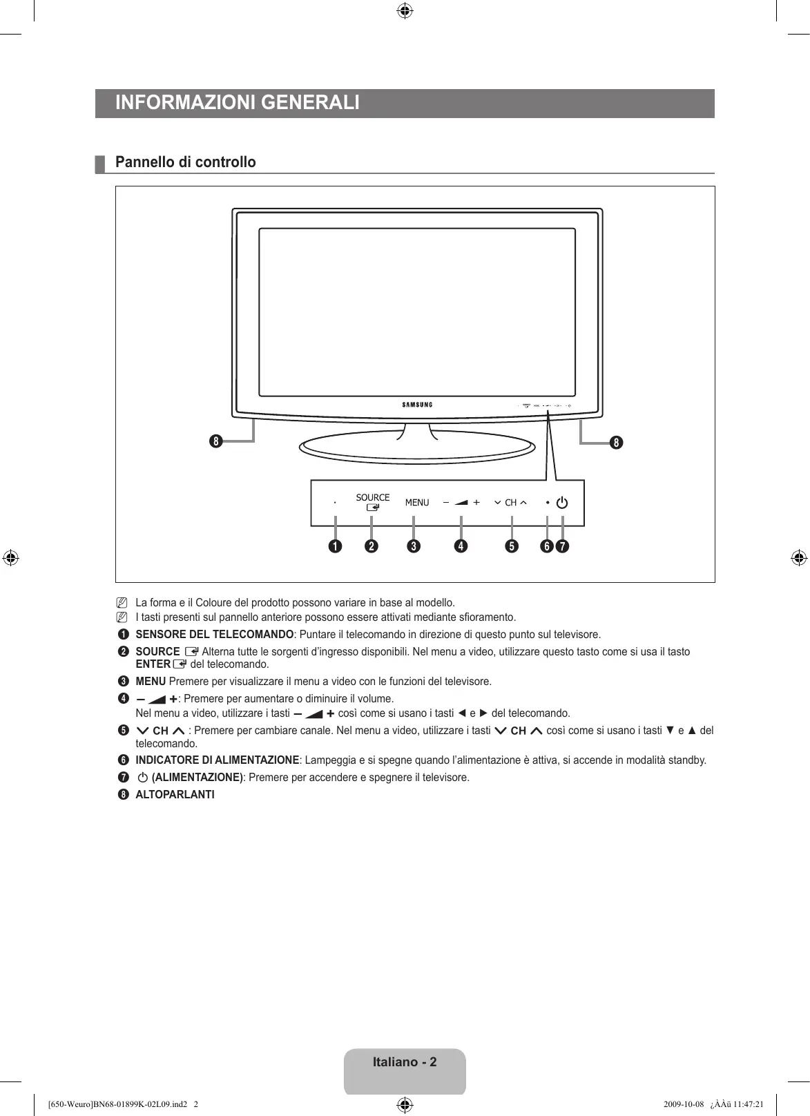 - ❑ Precauzioni da adottare quando si visualizza un'immagine fissa Un'immagine fissa può causare danni permanenti allo schermo TV ● Non visualizzare un’immagine fissa o parzialmente fissa sul pannello LCD per oltre 2 ore poiché può causare la ritenzione dell’immagine sullo schermo. Il fenomeno di ritenzione dell’immagine è anche noto come ‘bruciatura dello schermo’. Per evitare il fenomeno di ritenzione dell’immagine, ridurre il grado di luminosità e contrasto dello schermo quando si visualizza un’immagine fissa. Su un TV LCD, l’uso del formato 4:3 per un periodo di tempo prolungato può lasciare traccia dei bordi sulla parte sinistra, destra e centrale del video a causa delle differenti emissioni luminose dello schermo. La riproduzione di un DVD o l’uso di una console per videogiochi può causare effetti analoghi sullo schermo. Questo tipo di danni non è coperto dalla Garanzia. ● La visualizzazione prolungata di immagini fisse da videogiochi e PC può causare immagini residue parziali. Per evitare questo problema, ridurre la ‘luminosità’ e il ‘contrasto’ mentre si visualizzano immagini fisse. © 2009 Samsung Electronics Co., Ltd. Tutti i diritti riservati. [650-Weuro]BN68-01899K-02L09.ind1 1 2009-10-08 ¿ÀÀü 11:47:20 Contenuti INFORMAZIONI GENERALI ■ Pannello di controllo p. 2