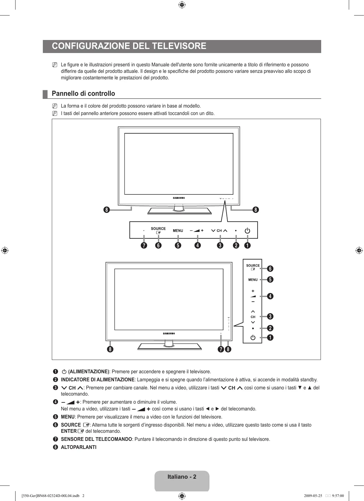 Nota Tasto One-Touch Tasto TOOLS Premere Italiano - [550-Ger]BN68-02324D-00L04.indb 1 2009-05-25 9:57:00 Configurazione del televisore N Le figure e le illustrazioni presenti in questo Manuale dell'utente sono fornite unicamente a titolo di riferimento e possono differire da quelle del prodotto attuale. Il design e le specifiche del prodotto possono variare senza preavviso allo scopo di migliorare costantemente le prestazioni del prodotto. ¦ Pannello di controllo N La forma e il colore del prodotto possono variare in base al modello. N I tasti del pannello anteriore possono essere attivati toccandoli con un dito.
