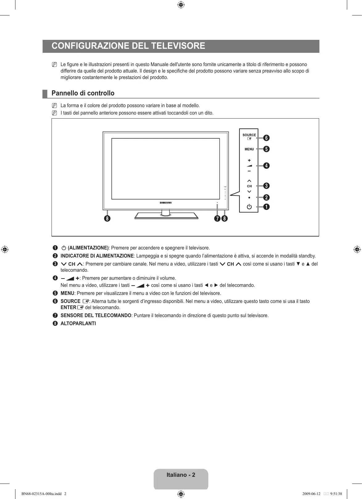 1 P (ALIMENTAZIONE): Premere per accendere e spegnere il televisore. 2 INDICATORE DI ALIMENTAZIONE: Lampeggia e si spegne quando l’alimentazione è attiva, si accende in modalità standby. 3 z: Premere per cambiare canale. Nel menu a video, utilizzare i tasti z così come si usano i tasti ▼ e ▲ del telecomando. 4 Y: Premere per aumentare o diminuire il volume. Nel menu a video, utilizzare i tasti Y così come si usano i tasti ◄ e ► del telecomando. 5 MENU: Premere per visualizzare il menu a video con le funzioni del televisore. 6 SOURCE E: Alterna tutte le sorgenti d’ingresso disponibili. Nel menu a video, utilizzare questo tasto come si usa il tasto ENTERE del telecomando. 7 SENSORE DEL TELECOMANDO: Puntare il telecomando in direzione di questo punto sul televisore. 8 ALTOPARLANTI Italiano - BN68-02315A-00Ita.indd 2 2009-06-12 9:51:38