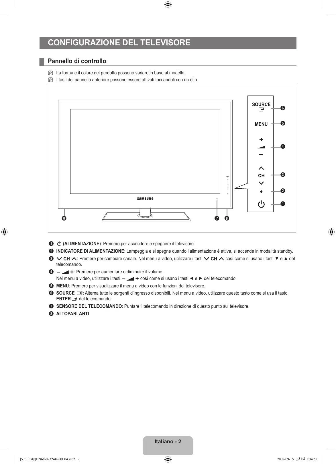 Nota Tasto One-Touch Tasto TOOLS Premere Italiano - [570_Italy]BN68-02324K-00L04.ind1 1 2009-09-15 ¿ÀÈÄ 1:34:52 Configurazione del televisore ¦ Pannello di controllo N La forma e il colore del prodotto possono variare in base al modello. N I tasti del pannello anteriore possono essere attivati toccandoli con un dito.