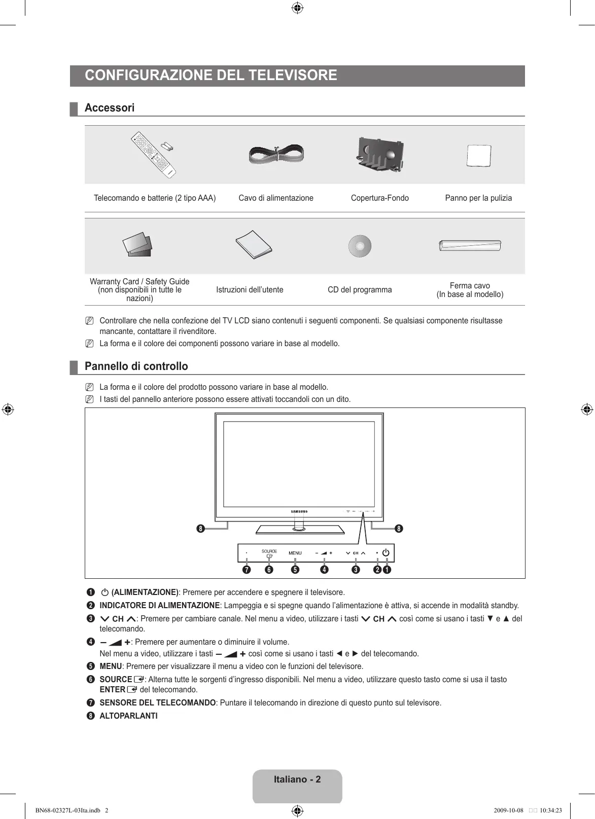 Nota Tasto One-Touch Tasto TOOLS Premere Italiano - BN68-02327L-03Ita.indb 1 2009-10-08 10:34:22 Configurazione del televisore ¦ Accessori Telecomando e batterie (2 tipo AAA) Warranty Card / Safety Guide (non disponibili in tutte le nazioni) Cavo di alimentazione Copertura-Fondo Istruzioni dell’utente Panno per la pulizia Ferma cavo (In base al modello) CD del programma N Controllare che nella confezione del TV LCD siano contenuti i seguenti componenti. Se qualsiasi componente risultasse mancante, contattare il rivenditore. N La forma e il colore dei componenti possono variare in base al modello. ¦ Pannello di controllo N La forma e il colore del prodotto possono variare in base al modello. N I tasti del pannello anteriore possono essere attivati toccandoli con un dito.