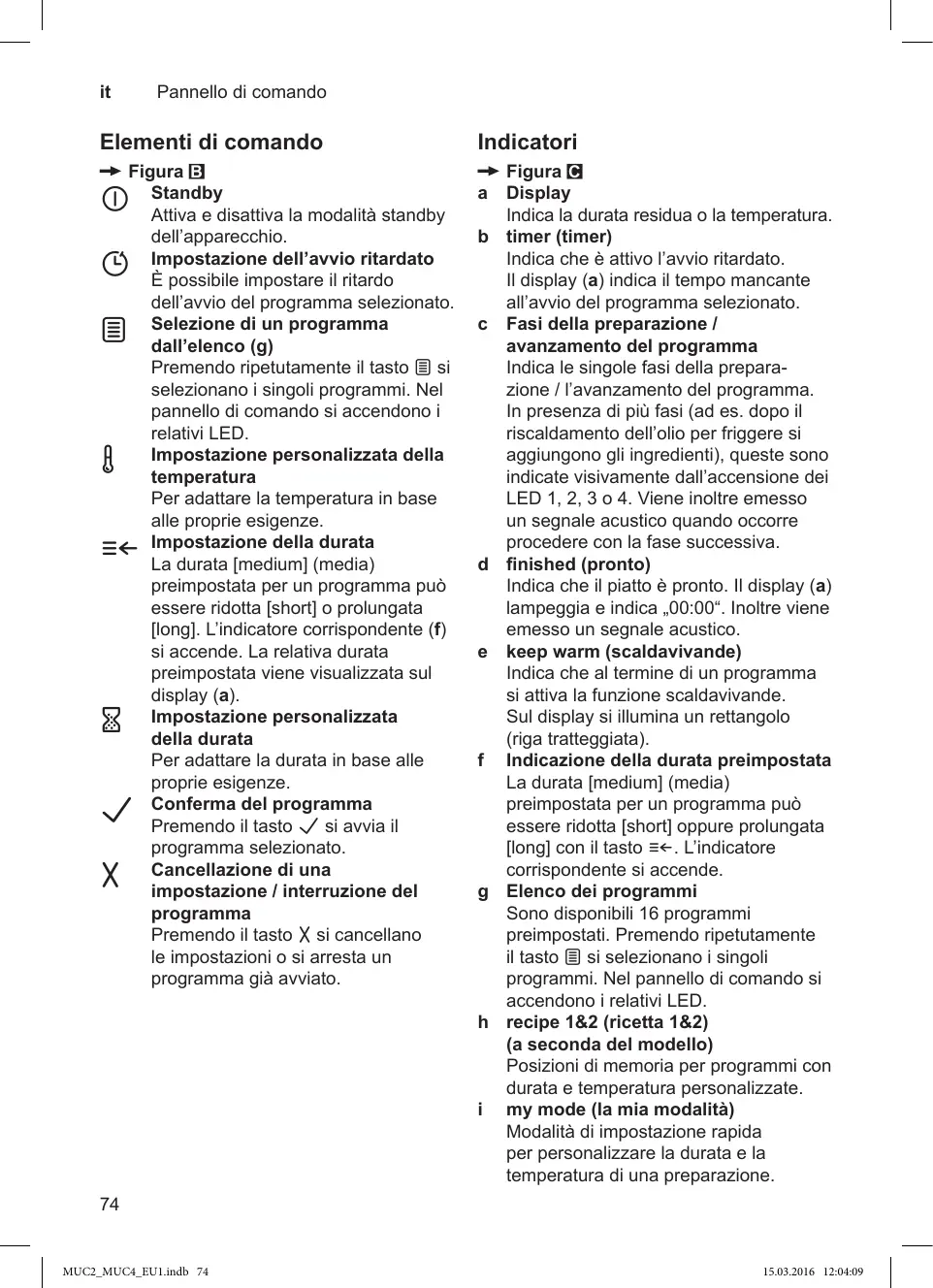 Affichage de la durée restante ou de la température. b Timer Indique que le retardateur de mise en marche est activé. L’affichage (a) indique la durée écoulée jusqu’au démarrage du programme de préparation sélectionné. c Étapes de préparation / Avancement du programme Affichage de chaque étape de préparation ou de l’avancement du programme. Dans le cas de plusieurs étapes de préparation (par exemple après le chauffage de l’huile de friture, on introduit les ingrédients), ces dernières s’affichent visuellement grâce à des LED 1, 2, 3 ou 4 qui s’affichent. De plus, un signal sonore retentit si une étape de préparation suivante est nécessaire. d prêt Indique que le plat est prêt. L’affichage (a) clignote et indique „00:00“. De plus, un signal sonore retentit. e maintien chaud Indique que la fonction maintien chaud est activée à la fin d’un programme de préparation. Un rectangle s’éclaire à l’affichage (ligne en pointillés). f Affichage de la durée de préparation préréglée La durée de préparation [moyen] préréglée pour un programme de préparation peut être raccourcie [court] ou allongée [long] à l’aide du bouton E. L’élément d’affichage correspondant s’éclaire. g Liste des programmes de préparation 16 programmes de préparation préréglés sont proposés. En appuyant plusieurs fois sur le bouton D, les programmes de préparation personnalisés s’affichent l’un après l’autre. Dans le bandeau de commande, la LED correspondante s’éclaire. 29
