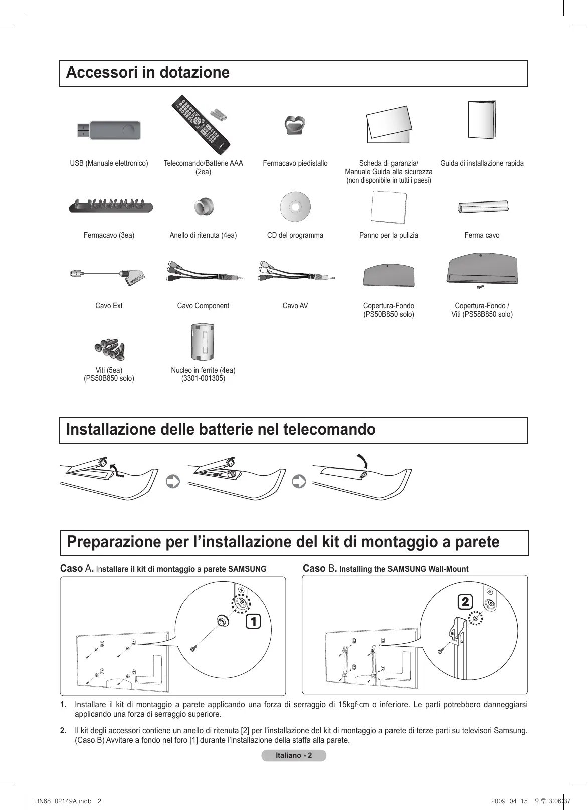 Installazione delle batterie nel telecomando Preparazione per l’installazione del di montaggio a parete Casekit B. Installing another company’s Wall-Mount Caso A. Installare il kit di montaggio a parete SAMSUNG Caso B. Installing the SAMSUNG Wall-Mount