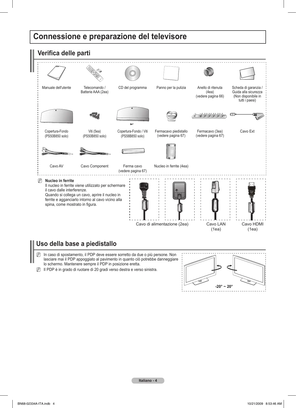 Nota Tasto One-Touch TOOLS Italiano - 3 BN68-02334A-ITA.indb 3 10/21/2009 8:53:38 AM Connessione e preparazione del televisore Verifica delle parti Manuale dell'utente Telecomando / Batterie AAA (2ea) CD del programma Panno per la pulizia Anello di ritenuta (4ea) (vedere pagina 66) Scheda di garanzia / Guida alla sicurezza (Non disponibile in tutti i paesi) Copertura-Fondo (PS50B850 solo) Viti (5ea) (PS50B850 solo) Copertura-Fondo / Viti (PS58B850 solo) Fermacavo piedistallo (vedere pagina 67) Fermacavo (3ea) (vedere pagina 67) Cavo Ext Cavo AV Cavo Component Ferma cavo (vedere pagina 67) Nucleo in ferrite (4ea) NN Nucleo in ferrite Il nucleo in ferrite viene utilizzato per schermare il cavo dalle interferenze. Quando si collega un cavo, aprire il nucleo in ferrite e agganciarlo intorno al cavo vicino alla spina, come mostrato in figura. Cavo di alimentazione (2ea) Cavo LAN (1ea) Cavo HDMI (1ea) Uso della base a piedistallo NN In caso di spostamento, il PDP deve essere sorretto da due o più persone. Non lasciare mai il PDP appoggiato al pavimento in quanto ciò potrebbe danneggiare lo schermo. Mantenere sempre il PDP in posizione eretta. NN Il PDP è in grado di ruotare di 20 gradi verso destra e verso sinistra. -20° ~ 20° Italiano - 4 BN68-02334A-ITA.indb 4 10/21/2009 8:53:46 AM Pannello di controllo Tasti del pannello frontale NN La forma e il colore del prodotto possono variare in base al modello.