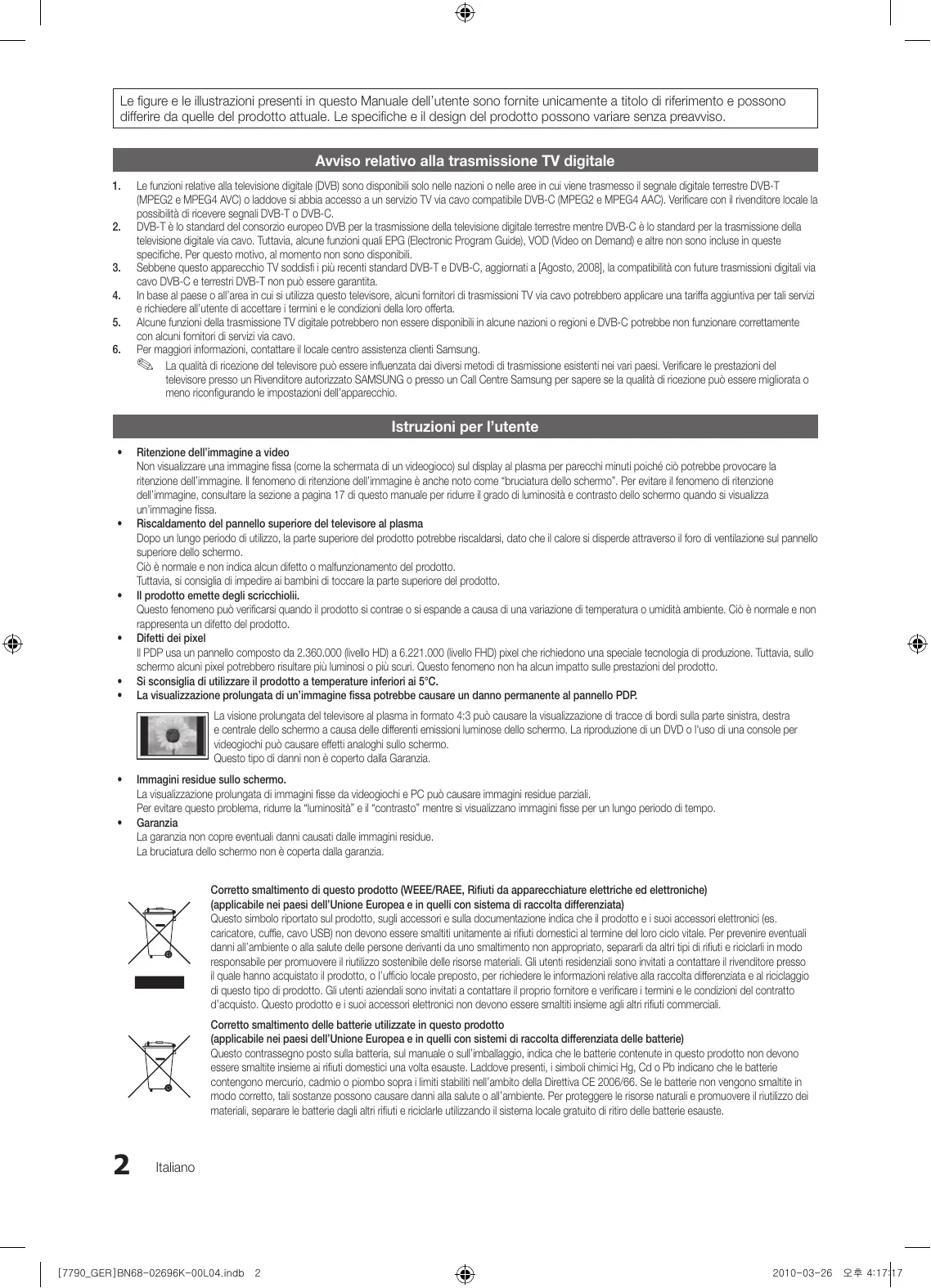 2010-03-26 오후 4:17:16 Le figure e le illustrazioni presenti in questo Manuale dell’utente sono fornite unicamente a titolo di riferimento e possono differire da quelle del prodotto attuale. Le specifiche e il design del prodotto possono variare senza preavviso. Avviso relativo alla trasmissione TV digitale