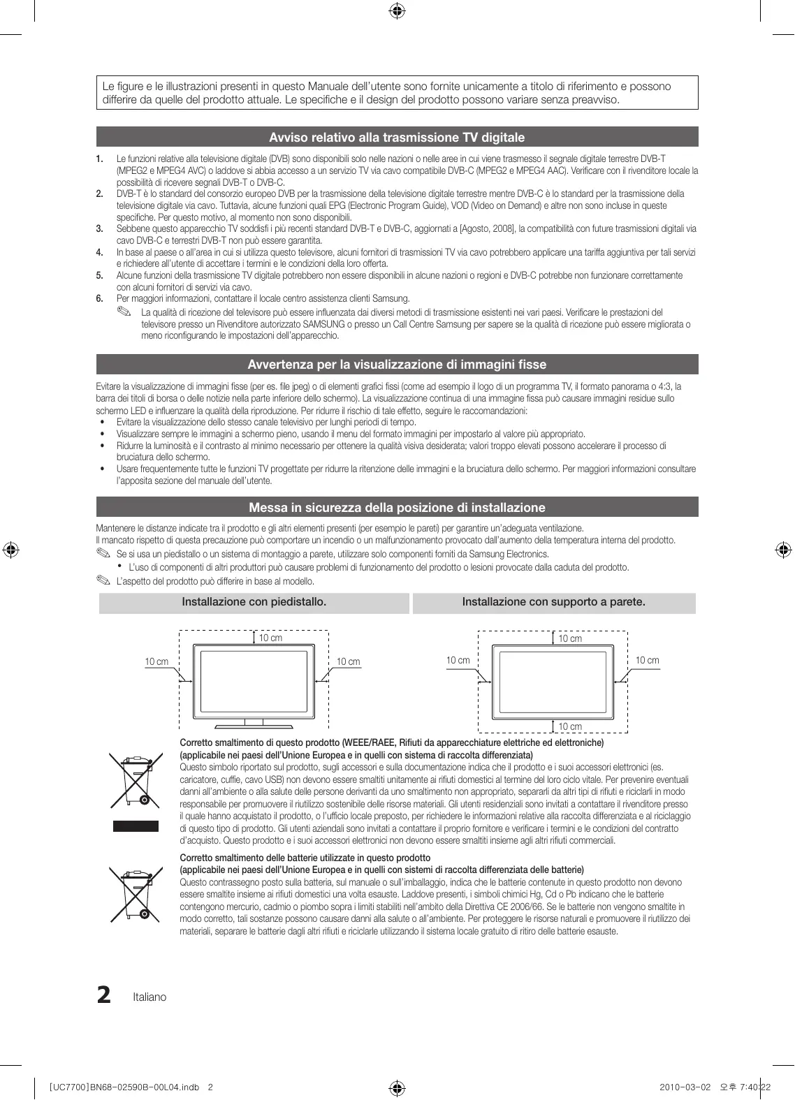 2010-03-02 오후 7:40:21 Le figure e le illustrazioni presenti in questo Manuale dell’utente sono fornite unicamente a titolo di riferimento e possono differire da quelle del prodotto attuale. Le specifiche e il design del prodotto possono variare senza preavviso. Avviso relativo alla trasmissione TV digitale