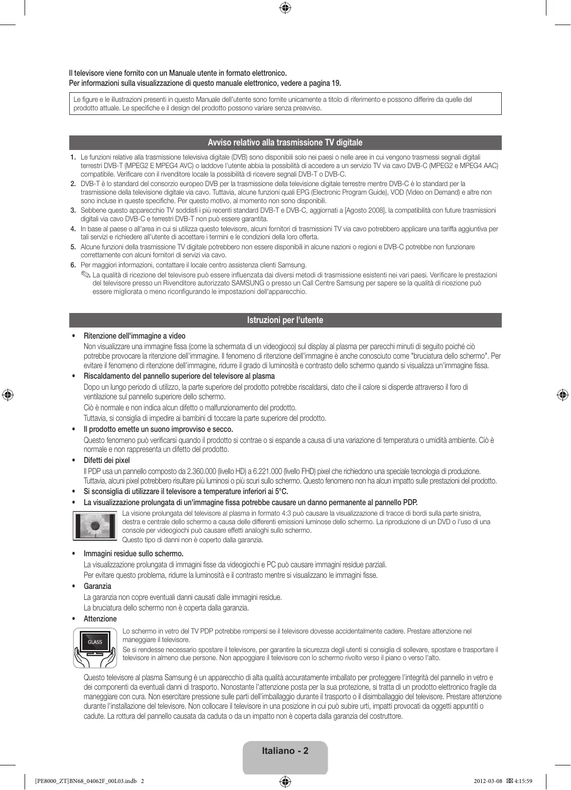 - • This equipment may be operated in all EU countries. Licence English - 24 [PE8000_ZT]BN68_04062F_00L03.indb 24 2012-03-08 4:15:59 Il televisore viene fornito con un Manuale utente in formato elettronico. Per informazioni sulla visualizzazione di questo manuale elettronico, vedere a pagina 19. Le figure e le illustrazioni presenti in questo Manuale dell'utente sono fornite unicamente a titolo di riferimento e possono differire da quelle del prodotto attuale. Le specifiche e il design del prodotto possono variare senza preavviso. Avviso relativo alla trasmissione TV digitale 1. Le funzioni relative alla trasmissione televisiva digitale (DVB) sono disponibili solo nei paesi o nelle aree in cui vengono trasmessi segnali digitali terrestri DVB-T (MPEG2 E MPEG4 AVC) o laddove l'utente abbia la possibilità di accedere a un servizio TV via cavo DVB-C (MPEG2 e MPEG4 AAC) compatibile. Verificare con il rivenditore locale la possibilità di ricevere segnali DVB-T o DVB-C. 2. DVB-T è lo standard del consorzio europeo DVB per la trasmissione della televisione digitale terrestre mentre DVB-C è lo standard per la trasmissione della televisione digitale via cavo. Tuttavia, alcune funzioni quali EPG (Electronic Program Guide), VOD (Video on Demand) e altre non sono incluse in queste specifiche. Per questo motivo, al momento non sono disponibili. 3. Sebbene questo apparecchio TV soddisfi i più recenti standard DVB-T e DVB-C, aggiornati a [Agosto 2008], la compatibilità con future trasmissioni digitali via cavo DVB-C e terrestri DVB-T non può essere garantita. 4. In base al paese o all'area in cui si utilizza questo televisore, alcuni fornitori di trasmissioni TV via cavo potrebbero applicare una tariffa aggiuntiva per tali servizi e richiedere all'utente di accettare i termini e le condizioni della loro offerta. 5. Alcune funzioni della trasmissione TV digitale potrebbero non essere disponibili in alcune nazioni o regioni e DVB-C potrebbe non funzionare correttamente con alcuni fornitori di servizi via cavo.
