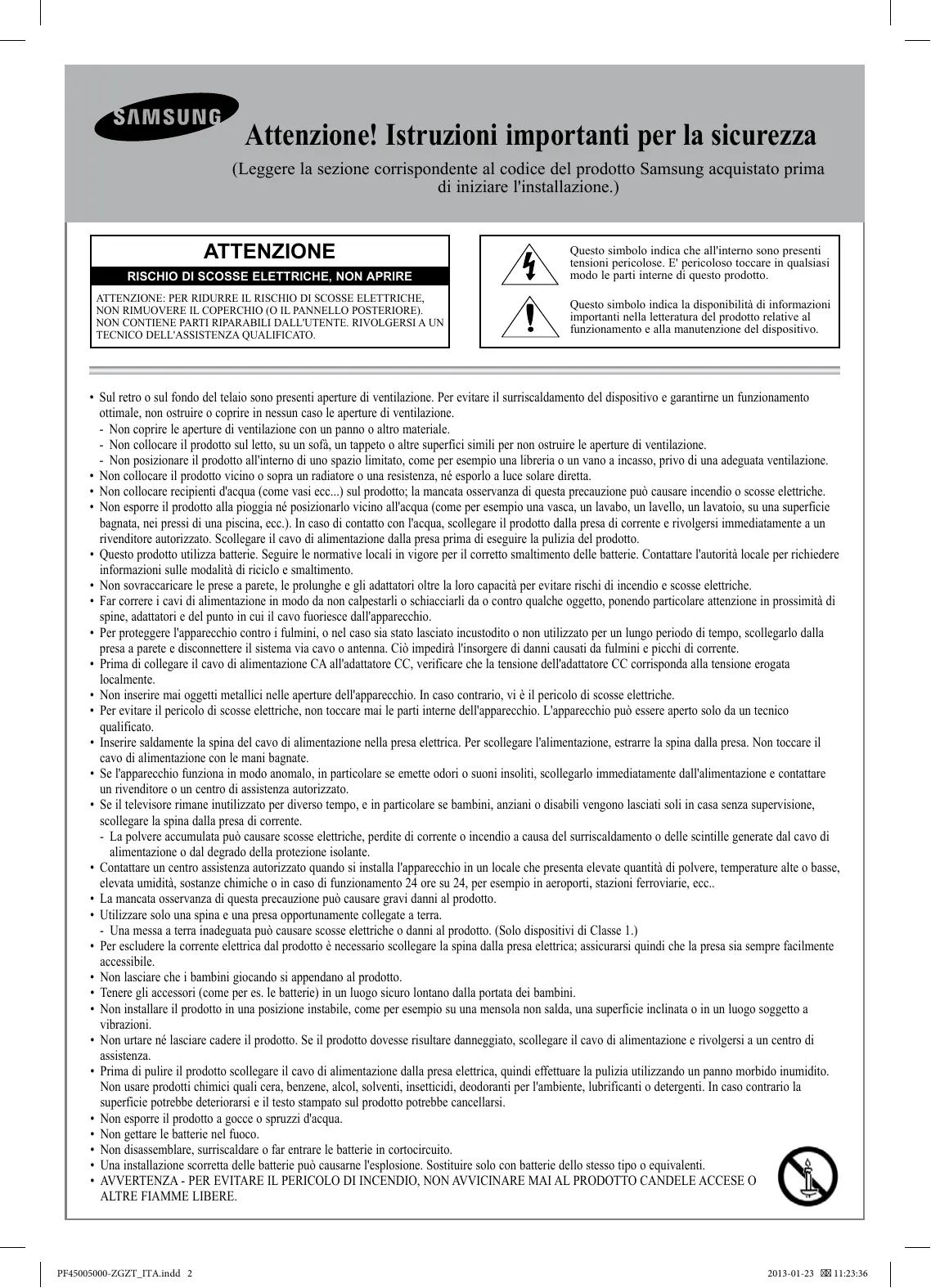 - AVVERTENZA - PER EVITARE IL PERICOLO DI INCENDIO, NON AVVICINARE MAI AL PRODOTTO CANDELE ACCESE O ALTRE FIAMME LIBERE. - Italiano PF45005000-ZGZT_ITA.indd 2 2013-01-23 11:23:36 Ulteriori informazioni sull'uso del Manuale elettronico (P. 9) Le figure e le illustrazioni presenti in questo Manuale dell'utente sono fornite unicamente a titolo di riferimento e possono differire da quelle del prodotto attuale. Le specifiche e il design del prodotto possono variare senza preavviso. Avviso relativo alla trasmissione TV digitale 1. Le funzioni relative alla televisione digitale (DVB) sono disponibili solo nelle nazioni o nelle aree in cui viene trasmesso il segnale digitale terrestre DVB-T (MPEG2 e MPEG4 AVC) o laddove si abbia accesso a un servizio TV via cavo compatibile DVB-C (MPEG2 e MPEG4 AAC). Verificare con il rivenditore locale la possibilità di ricevere segnali DVB-T o DVB-C. 2. DVB-T è lo standard del consorzio europeo DVB per la trasmissione della televisione digitale terrestre mentre DVB-C è lo standard per la trasmissione della televisione digitale via cavo. Tuttavia, alcune funzioni quali EPG (Electronic Program Guide), VOD (Video on Demand) e altre non sono incluse in queste specifiche. Per questo motivo, al momento non sono disponibili. 3. Sebbene questo apparecchio TV soddisfi i più recenti standard DVB-T e DVB-C, aggiornati a [Agosto, 2008], la compatibilità con future trasmissioni digitali via cavo DVB-C e terrestri DVB-T non può essere garantita. 4. In base al paese o all'area in cui si utilizza questo televisore, alcuni fornitori di trasmissioni TV via cavo potrebbero applicare una tariffa aggiuntiva per tali servizi e richiedere all'utente di accettare i termini e le condizioni della loro offerta. 5. Alcune funzioni della trasmissione TV digitale potrebbero non essere disponibili in alcune nazioni o regioni e DVB-C potrebbe non funzionare correttamente con alcuni fornitori di servizi via cavo.