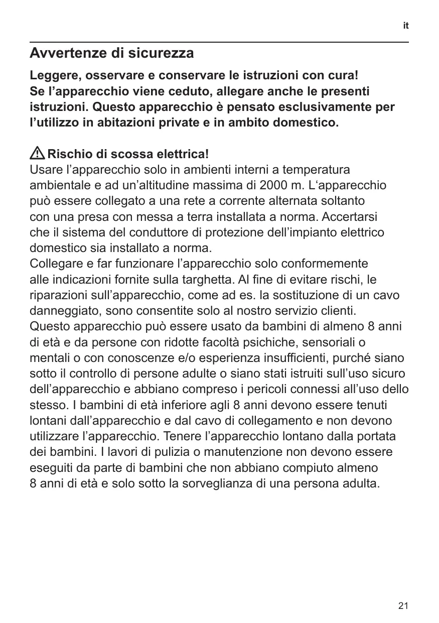 Avvertenze di sicurezza Leggere, osservare e conservare le istruzioni con cura! Se l’apparecchio viene ceduto, allegare anche le presenti istruzioni. Questo apparecchio è pensato esclusivamente per l’utilizzo in abitazioni private e in ambito domestico. W Rischio di scossa elettrica! Usare l’apparecchio solo in ambienti interni a temperatura ambientale e ad un’altitudine massima di 2000 m. L‘apparecchio può essere collegato a una rete a corrente alternata soltanto con una presa con messa a terra installata a norma. Accertarsi che il sistema del conduttore di protezione dell’impianto elettrico domestico sia installato a norma. Collegare e far funzionare l’apparecchio solo conformemente alle indicazioni fornite sulla targhetta. Al fine di evitare rischi, le riparazioni sull’apparecchio, come ad es. la sostituzione di un cavo danneggiato, sono consentite solo al nostro servizio clienti. Questo apparecchio può essere usato da bambini di almeno 8 anni di età e da persone con ridotte facoltà psichiche, sensoriali o mentali o con conoscenze e/o esperienza insufficienti, purché siano sotto il controllo di persone adulte o siano stati istruiti sull’uso sicuro dell’apparecchio e abbiano compreso i pericoli connessi all’uso dello stesso. I bambini di età inferiore agli 8 anni devono essere tenuti lontani dall’apparecchio e dal cavo di collegamento e non devono utilizzare l’apparecchio. Tenere l’apparecchio lontano dalla portata dei bambini. I lavori di pulizia o manutenzione non devono essere eseguiti da parte di bambini che non abbiano compiuto almeno 8 anni di età e solo sotto la sorveglianza di una persona adulta.