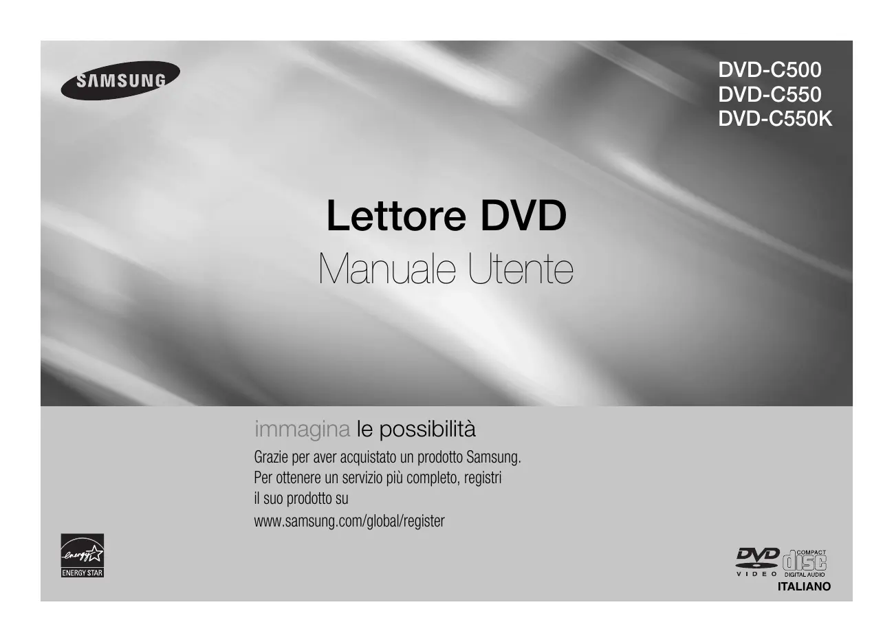 Philippines - lorsqu'un équipement auxiliaire non fourni ou non recommandé par Samsung est fixé sur le produit ou utilisé en conjonction avec celui-ci ; - au cas où la carte de garantie ne serait pas dument remplie ". Area Canada Mexico U.S.A Argentine Brazil Chile Nicaragua Honduras Costa Rica Ecuador El Salvador Guatemala Jamaica Panama Puerto Rico Rep. Dominica Trinidad & Tobago Venezuela Colombia Singapore Thailand Taiwan Vietnam Turkey South Africa U.A.E Web Site www.samsung.com/ca www.samsung.com/mx www.samsung.com/us www.samsung.com/ar www.samsung.com/br www.samsung.com/cl www.samsung.com/latin www.samsung.com/latin www.samsung.com/latin www.samsung.com/latin www.samsung.com/latin www.samsung.com/latin www.samsung.com/latin www.samsung.com/latin www.samsung.com/latin www.samsung.com/latin www.samsung.com/latin www.samsung.com/latin www.samsung.com.co www.samsung.com/be (Dutch) www.samsung.com/be_fr (French) www.samsung.com/cz www.samsung.com/dk www.samsung.com/fi www.samsung.com/fr www.samsung.de www.samsung.com/hu www.samsung.com/it www.samsung.com/lu www.samsung.com/nl www.samsung.com/no www.samsung.com/pl www.samsung.com/pt www.samsung.com/sk www.samsung.com/es www.samsung.com/se www.samsung.com/uk www.samsung.com/ie www.samsung.com/at www.samsung.com/ch www.samsung.com/ch_fr/ (French) www.samsung.ru www.samsung.com/kz_ru www.samsung.com/kz_ru www.samsung.ua www.samsung.com/ua_ru www.samsung.com/lt www.samsung.com/lv www.samsung.com/ee www.samsung.com/au www.samsung.com/nz www.samsung.com/cn www.samsung.com/hk www.samsung.com/hk_en/ www.samsung.com/in www.samsung.com/id www.samsung.com/jp www.samsung.com/my www.samsung.com/ph www.samsung.com/sg www.samsung.com/th www.samsung.com/tw www.samsung.com/vn www.samsung.com/tr www.samsung.com/za www.samsung.com/ae DVD-C500 DVD-C550 DVD-C550K Lettore DVD Manuale Utente immagina le possibilità Grazie per aver acquistato un prodotto Samsung. Per ottenere un servizio più completo, registri il suo prodotto su www.samsung.com/global/register ITALIANO Precauzioni 1 Impostazione - Per la tensione d'esercizio corretta, fare riferimento all'etichetta di identificazione sul retro del lettore. - Installare il lettore in un luogo dotato di adeguate aperture di ventilazione. (7~10cm) Non bloccare le aperture di ventilazione sui componenti per non ostacolare la circolazi one dell'aria. - Non spingere il vano del disco manualmente. - Non impilare i componenti. - Prima di spostare il lettore, assicurarsi di aver spento tutti i componenti. - Prima di collegare altri componenti al lettore, controllare che siano spenti. - Dopo l'uso, rimuovere il disco e spegnere il lettore, in particolare se non si prevede di utilizzarlo per un lungo periodo di tempo. - La presa di rete viene utilizzata per scollegare l’apparecchio e deve essere facilmente accesibile in qualsiasi istante.