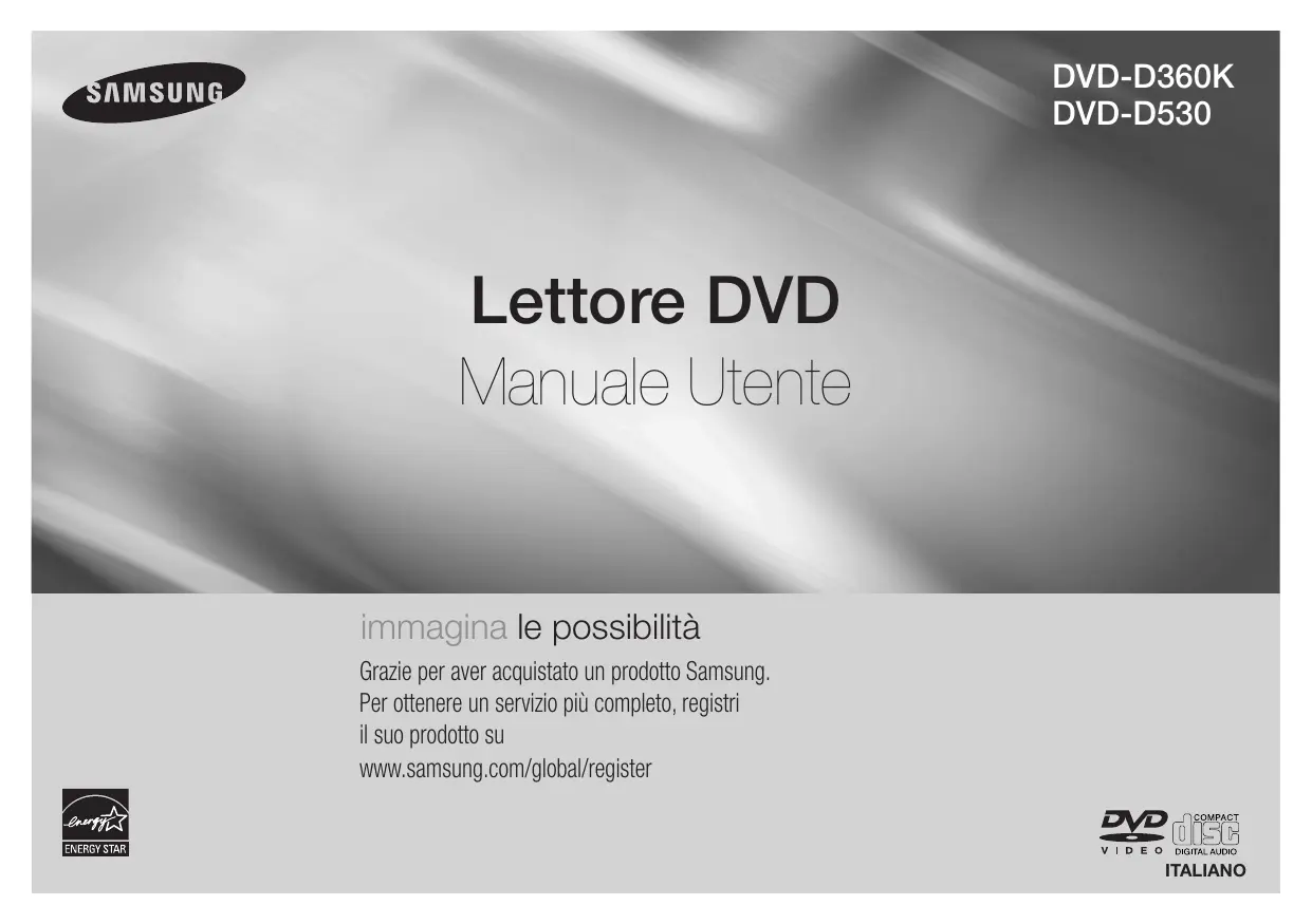 Philippines - lorsqu'un équipement auxiliaire non fourni ou non recommandé par Samsung est fixé sur le produit ou utilisé en conjonction avec celui-ci ; - au cas où la facture d'achat et/ou la carte de garantie ne seraient pas retournées ; - au cas où la carte de garantie ne serait pas dument remplie ". Area Canada Mexico U.S.A Argentine Brazil Chile Nicaragua Honduras Costa Rica Ecuador El Salvador Guatemala Jamaica Panama Puerto Rico Rep. Dominica Trinidad & Tobago Venezuela Colombia Middle East & Africa Singapore Thailand Taiwan Vietnam Turkey South Africa U.A.E Web Site www.samsung.com/ca www.samsung.com/mx www.samsung.com/us www.samsung.com/ar www.samsung.com/br www.samsung.com/cl www.samsung.com/latin www.samsung.com/latin www.samsung.com/latin www.samsung.com/latin www.samsung.com/latin www.samsung.com/latin www.samsung.com/latin www.samsung.com/latin www.samsung.com/latin www.samsung.com/latin www.samsung.com/latin www.samsung.com/latin www.samsung.com.co www.samsung.com/be (Dutch) www.samsung.com/be_fr (French) www.samsung.com/cz www.samsung.com/dk www.samsung.com/fi www.samsung.com/fr www.samsung.de www.samsung.com/hu www.samsung.com/it www.samsung.com/lu www.samsung.com/nl www.samsung.com/no www.samsung.com/pl www.samsung.com/pt www.samsung.com/sk www.samsung.com/es www.samsung.com/se www.samsung.com/uk www.samsung.com/ie www.samsung.com/at www.samsung.com/ch www.samsung.com/ch_fr/ (French) www.samsung.ru www.samsung.com/kz_ru www.samsung.com/kz_ru www.samsung.ua www.samsung.com/ua_ru www.samsung.com/lt www.samsung.com/lv www.samsung.com/ee www.samsung.com/au www.samsung.com/nz www.samsung.com/cn www.samsung.com/hk www.samsung.com/hk_en/ www.samsung.com/in www.samsung.com/id www.samsung.com/jp www.samsung.com/my www.samsung.com/ph www.samsung.com/sg www.samsung.com/th www.samsung.com/tw www.samsung.com/vn www.samsung.com/tr www.samsung.com/za www.samsung.com/ae DVD-D360K DVD-D530 Lettore DVD Manuale Utente immagina le possibilità Grazie per aver acquistato un prodotto Samsung. Per ottenere un servizio più completo, registri il suo prodotto su www.samsung.com/global/register ITALIANO Precauzioni 1 Impostazione - Per la tensione d'esercizio corretta, fare riferimento all'etichetta di identificazione sul retro del lettore. - Installare il lettore in un luogo dotato di adeguate aperture di ventilazione. (7~10cm) Non bloccare le aperture di ventilazione sui componenti per non ostacolare la circolazi one dell'aria. - Non spingere il vano del disco manualmente. - Non impilare i componenti. - Prima di spostare il lettore, assicurarsi di aver spento tutti i componenti. - Prima di collegare altri componenti al lettore, controllare che siano spenti. - Dopo l'uso, rimuovere il disco e spegnere il lettore, in particolare se non si prevede di utilizzarlo per un lungo periodo di tempo. - La presa di rete viene utilizzata per scollegare l’apparecchio e deve essere facilmente accesibile in qualsiasi istante.