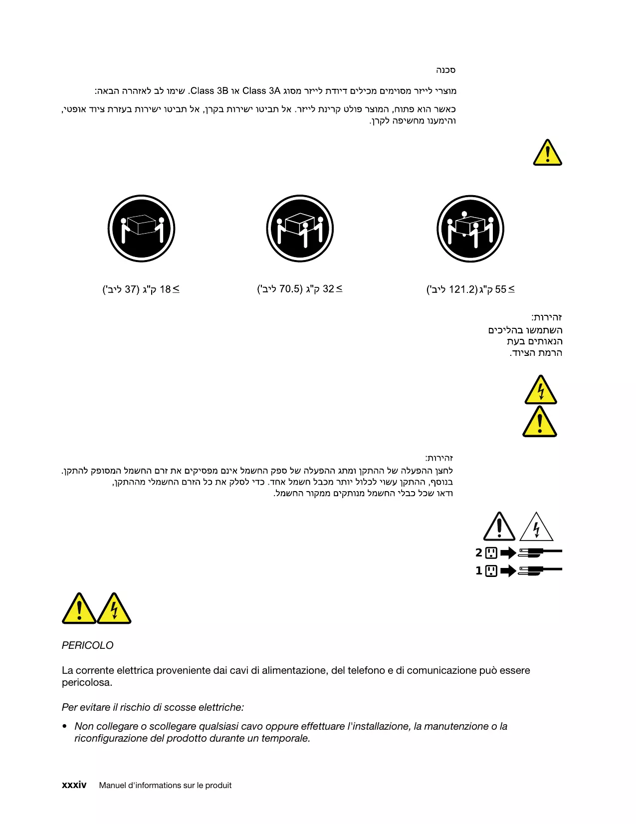 - Non collegare o scollegare qualsiasi cavo oppure effettuare l'installazione, la manutenzione o la riconfigurazione del prodotto durante un temporale. xxxiv Manuel d'informations sur le produit