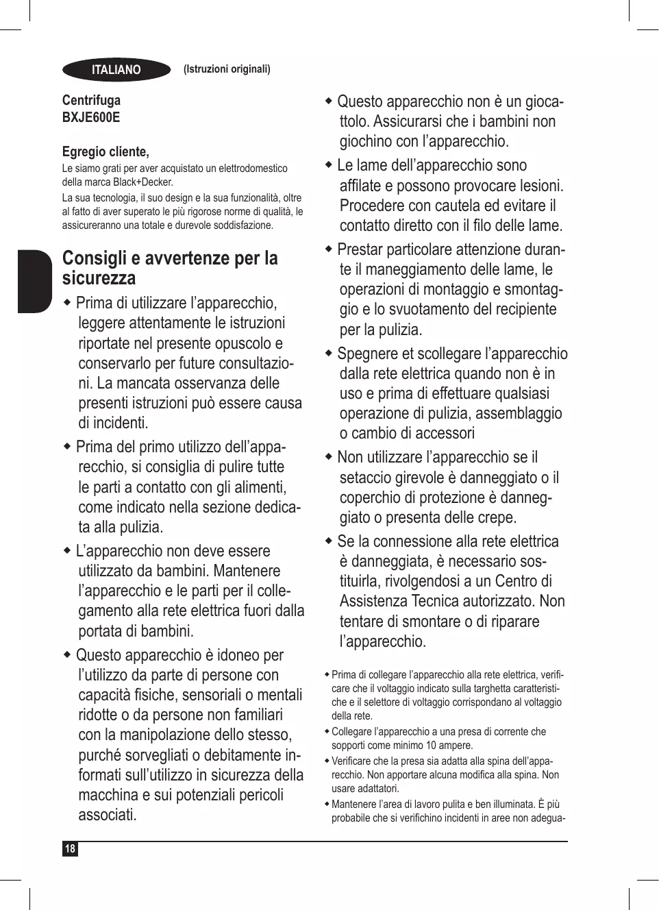 ITALIANO (Istruzioni originali) Centrifuga BXJE600E Egregio cliente, Le siamo grati per aver acquistato un elettrodomestico della marca Black+Decker. La sua tecnologia, il suo design e la sua funzionalità, oltre al fatto di aver superato le più rigorose norme di qualità, le assicureranno una totale e durevole soddisfazione. Consigli e avvertenze per la sicurezza Prima di utilizzare l’apparecchio, leggere attentamente le istruzioni riportate nel presente opuscolo e conservarlo per future consultazioni. La mancata osservanza delle presenti istruzioni può essere causa di incidenti. Prima del primo utilizzo dell’apparecchio, si consiglia di pulire tutte le parti a contatto con gli alimenti, come indicato nella sezione dedicata alla pulizia. L’apparecchio non deve essere utilizzato da bambini. Mantenere l’apparecchio e le parti per il collegamento alla rete elettrica fuori dalla portata di bambini. Questo apparecchio è idoneo per l’utilizzo da parte di persone con capacità fisiche, sensoriali o mentali ridotte o da persone non familiari con la manipolazione dello stesso, purché sorvegliati o debitamente informati sull’utilizzo in sicurezza della macchina e sui potenziali pericoli associati.