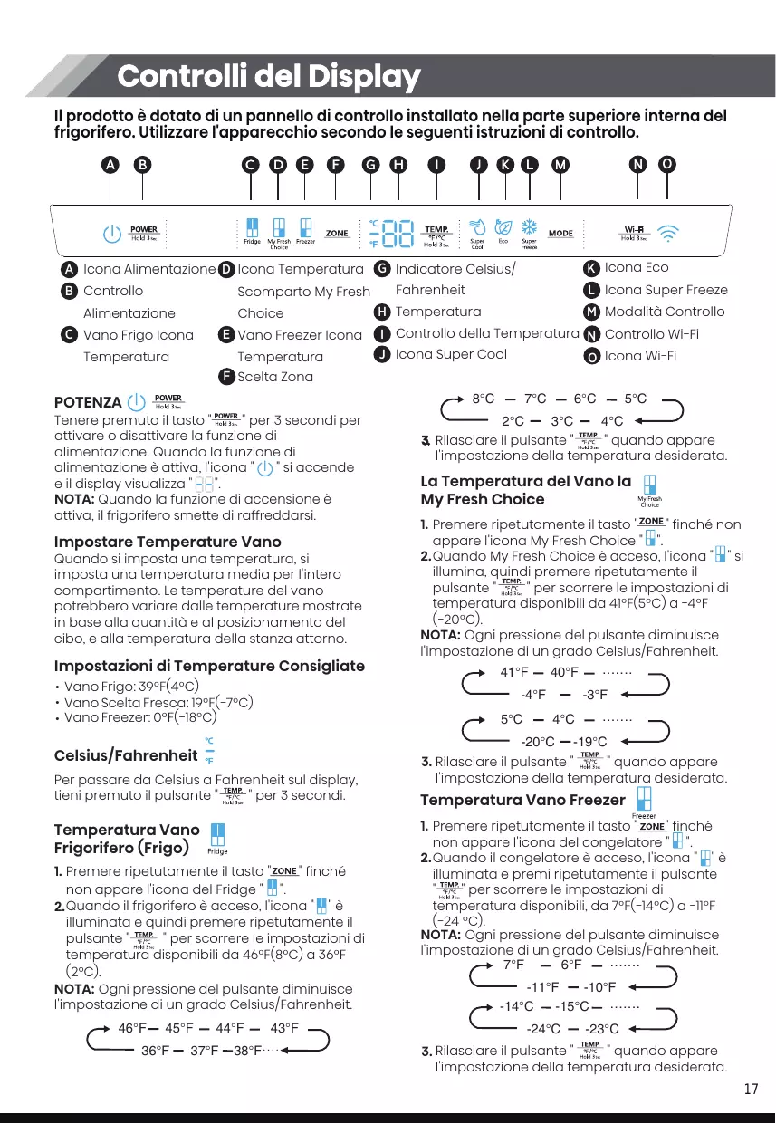 Impostazioni di Temperature Consigliate • Vano Frigo: 39°F(4°C) • Vano Scelta Fresca: 19°F(-7°C) • Vano Freezer: 0°F(-18°C)