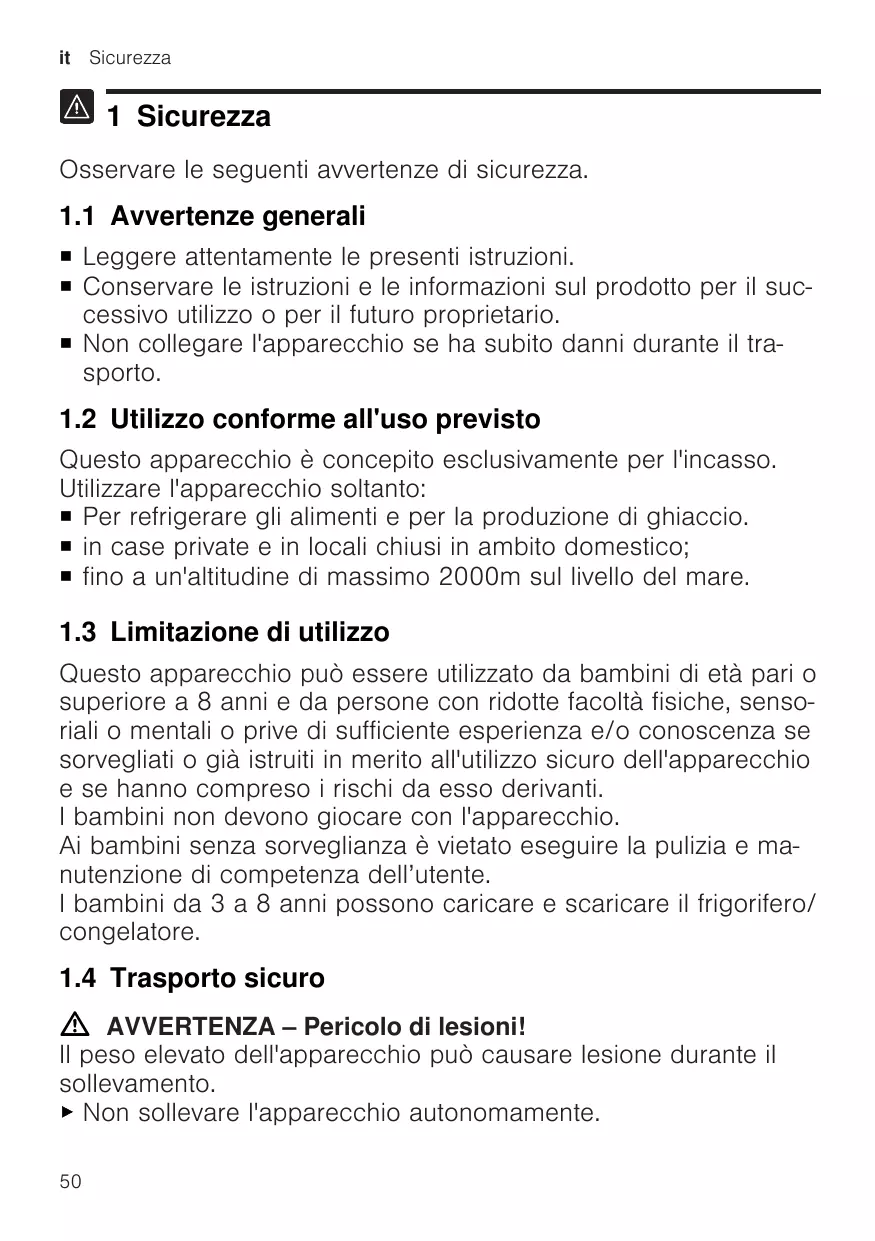Questo apparecchio può essere utilizzato da bambini di età pari o superiore a 8 anni e da persone con ridotte facoltà fisiche, sensoriali o mentali o prive di sufficiente esperienza e/o conoscenza se sorvegliati o già istruiti in merito all'utilizzo sicuro dell'apparecchio e se hanno compreso i rischi da esso derivanti. I bambini non devono giocare con l'apparecchio. Ai bambini senza sorveglianza è vietato eseguire la pulizia e manutenzione di competenza dell’utente. I bambini da 3 a 8 anni possono caricare e scaricare il frigorifero/ congelatore.