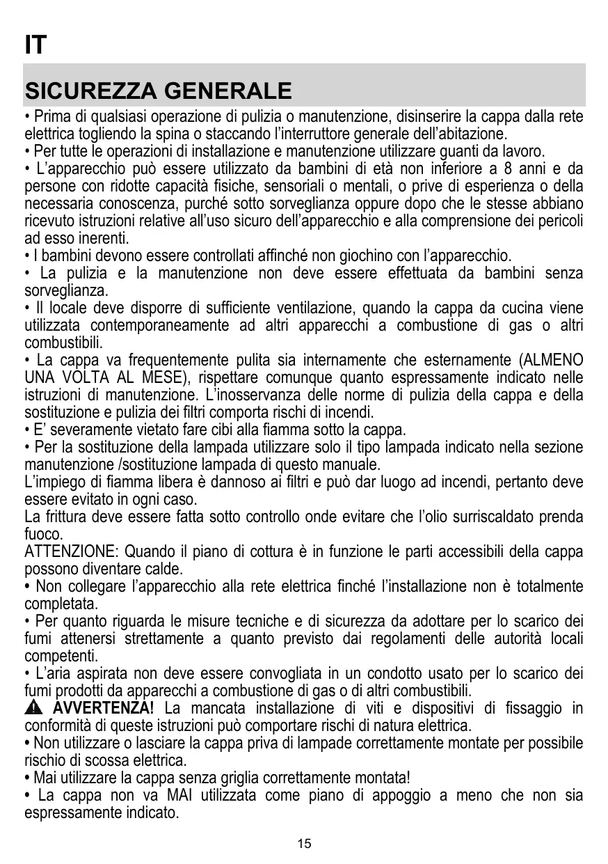 • Les enfants ne doivent pas jouer avec l’appareil. • Le nettoyage et l’entretien par l’usager ne doivent pas être effectués par des enfants sans surveillance. • La pièce doit avoir une aération suffisante lorsque la hotte est utilisée conjointement avec d'autres appareils fonctionnant au gaz ou autres combustibles. • La hotte doit être régulièrement nettoyée à la fois à l'intérieur et à l'extérieur (AU MOINS UNE FOIS PAR MOIS); cela devrait se faire en conformité avec les instructions d'entretien. Le non respect des instructions expressément fournies concernant le nettoyage de la hotte et des filtres peut provoquer des risques d'incendie. • Ne pas flamber d’aliments sous la hotte. • Pour le remplacement de la lampe, utilisez uniquement le type de lampe spécifié dans la section remplacement/maintenance lampe dans ce manuel. L'utilisation d'une flamme nue est dommageable pour les filtres et peut causer un incendie, par conséquent, il est déconseillé de l'utiliser. La friture doit être faite avec soin afin de s’assurer que l’huile surchauffée ne prenne pas feu. AVERTISSEMENT: Lorsque la table de cuisson est en fonctionnement, les parties accessibles de la hotte peuvent devenir très chaudes. • Ne pas brancher l'appareil au réseau électrique avant que l'installation ne soit complètement terminée. • En ce qui concerne les mesures techniques et de sécurité à prendre pour l'évacuation des fumées, respectez strictement les dispositions des règlements locales. • L’air ne doit pas être envoyé dans un conduit utilisé pour évacuer les fumées d’appareils utilisant du gaz ou un autre combustible. ATTENTION ! Le défaut d'installer les vis et les dispositifs de fixation conformément à ces instructions peut entraîner des risques électriques. • Ne pas utiliser ou laisser la hotte sans les lampes correctement montées, car un éventuel risque de choc électrique est possible. • N’utilisez jamais la hotte sans la grille montée correctement! • La hotte ne doit JAMAIS être utilisée comme une surface d'appui, sauf indication expresse. • Utilisez uniquement les vis de fixation fournies avec le produit pour l'installation, ou, si 36