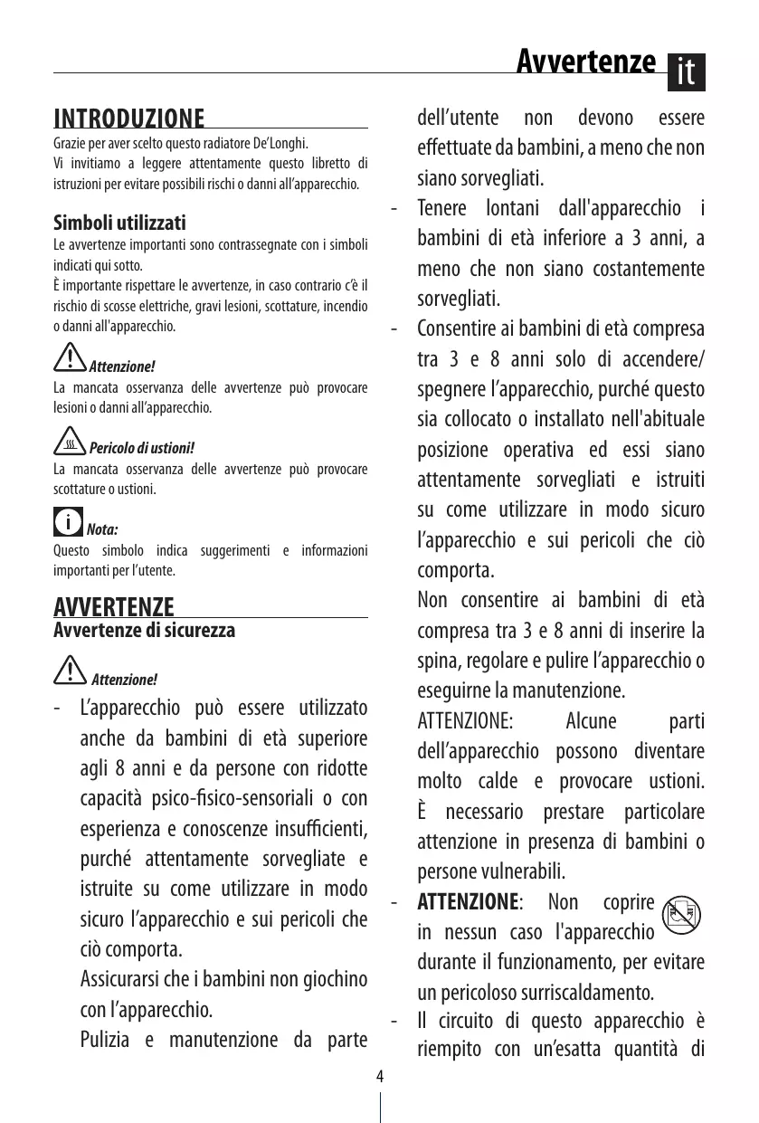 INTRODUZIONE Grazie per aver scelto questo radiatore De’Longhi. Vi invitiamo a leggere attentamente questo libretto di istruzioni per evitare possibili rischi o danni all’apparecchio.