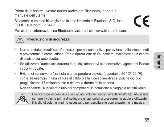 Prima di utilizzare il vostro nuovo auricolare Bluetooth, leggete il manuale dell'utente. Bluetooth® è un marchio registrato in tutto il mondo di Bluetooth SIG, Inc. — QD ID Bluetooth: 016470 Per ulteriori informazioni su Bluetooth, visitare il sito www.bluetooth.com. Precauzioni di sicurezza •