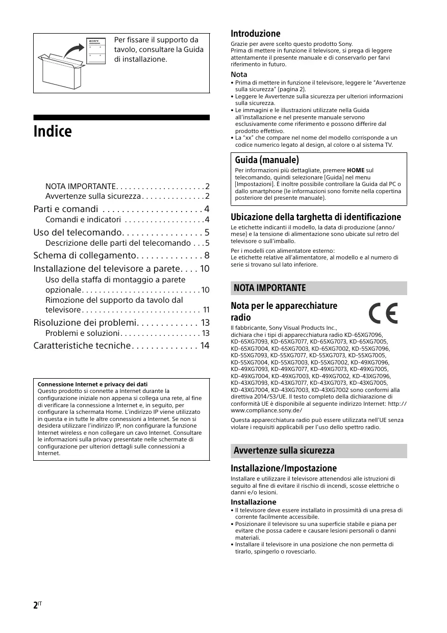 Scarica le istruzioni per il tuo TV in formato PDF gratuitamente! Trova il tuo manuale KD435XG7077SAEP - SONY e riprendi in mano il tuo dispositivo elettronico. In questa pagina sono pubblicati tutti i documenti necessari per l'utilizzo del tuo dispositivo. KD435XG7077SAEP del marchio SONY.