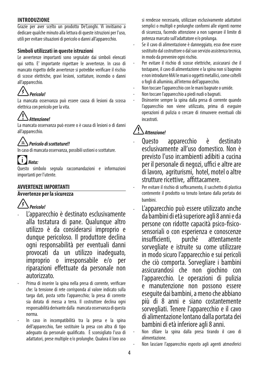 INTRODUZIONE Grazie per aver scelto un prodotto De’Longhi. Vi invitiamo a dedicare qualche minuto alla lettura di queste istruzioni per l’uso, utili per evitare situazioni di pericolo o danni all’apparecchio.