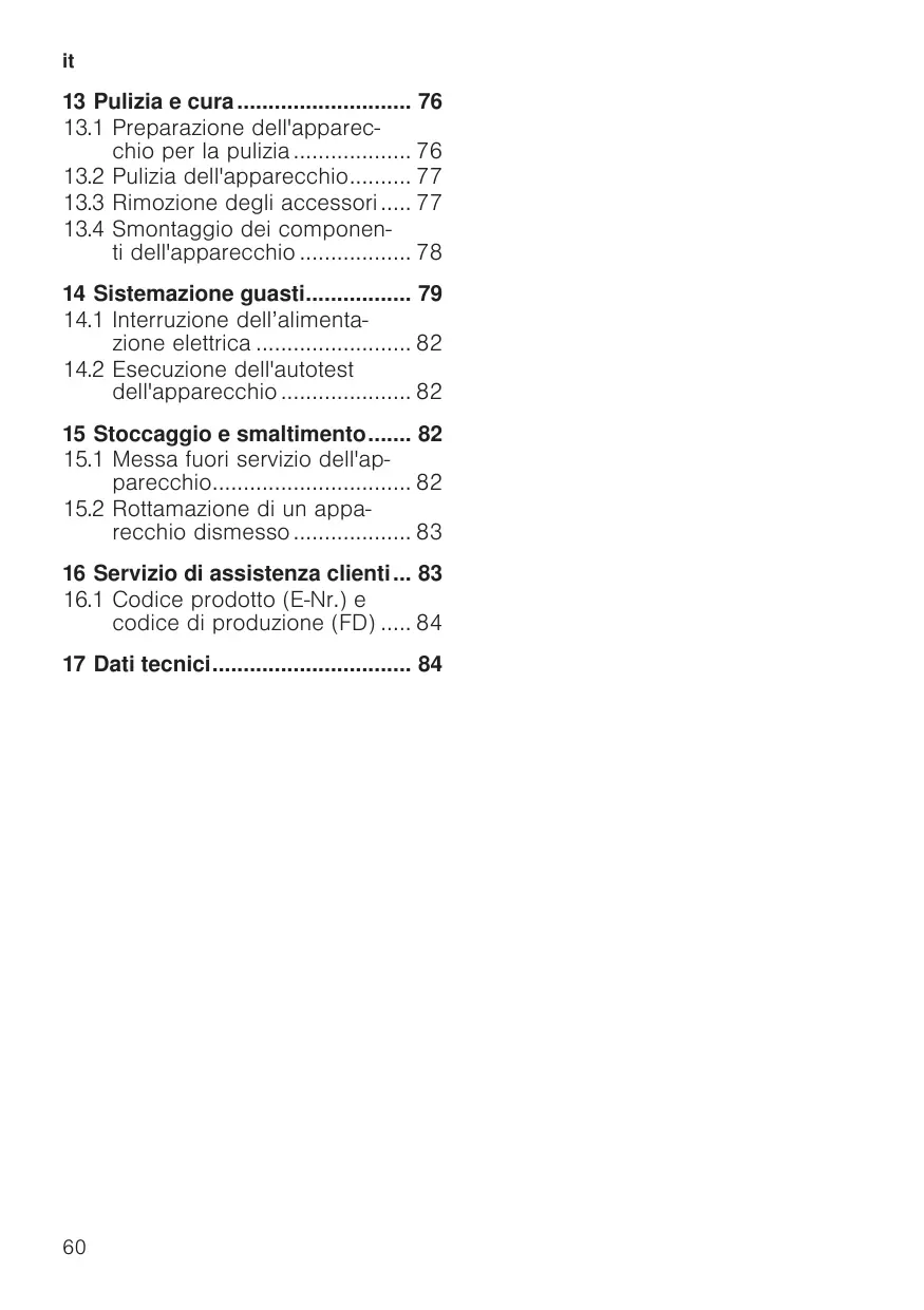 13 Pulizia e cura 76 13.1 Preparazione dell'apparecchio per la pulizia 76 13.2 Pulizia dell'apparecchio 77 13.3 Rimozione degli accessori 77 13.4 Smontaggio dei componenti dell'apparecchio 78 14 Sistemazione guasti 79 14.1 Interruzione dell’alimentazione elettrica 82 14.2 Esecuzione dell'autotest dell'apparecchio 82 15 Stoccaggio e smaltimento 82 15.1 Messa fuori servizio dell'apparecchio 82 15.2 Rottamazione di un apparecchio dismesso 83 16 Servizio di assistenza clienti ... 83 16.1 Codice prodotto (E-Nr.) e codice di produzione (FD) 84 17 Dati tecnici 84