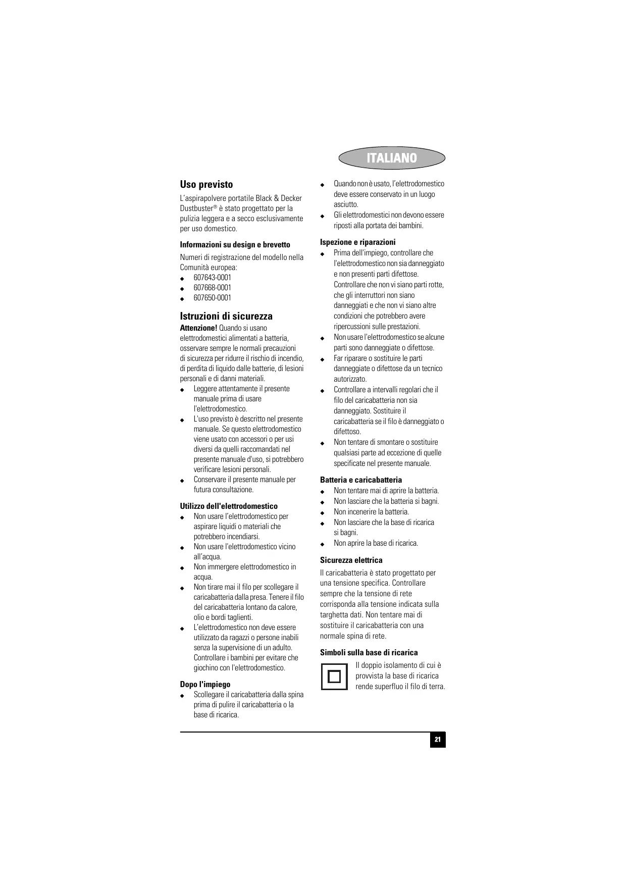 L’aspirapolvere portatile Black & Decker Dustbuster® è stato progettato per la pulizia leggera e a secco esclusivamente per uso domestico. Informazioni su design e brevetto Numeri di registrazione del modello nella Comunità europea: X 607643-0001 X 607668-0001 X 607650-0001