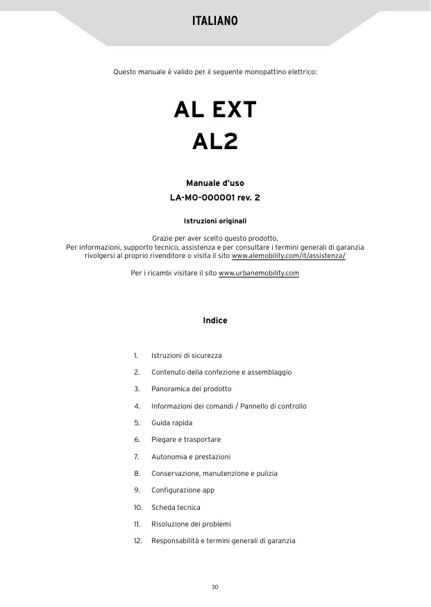 N'utilisez pas d'accessoires et / ou de pièces supplémentaires non approuvés par le fabricant. Tenez les enfants à l'écart des pièces en plastique (y compris les matériaux d'emballage) et des petites pièces qui peuvent provoquer une suffocation. Il est interdit de modifier ou de transformer le produit ou ses parties de quelque manière que ce soit, car cela pourrait nuire à l'efficacité, à la structure et causer des dommages. Si vous détectez des défauts d'usine, des bruits inhabituels ou des anomalies, ne conduisez pas le véhicule et contactez votre concessionnaire ou visitez le site www.alemobility.com/en/ pour bénéficier de l’assistance technique.