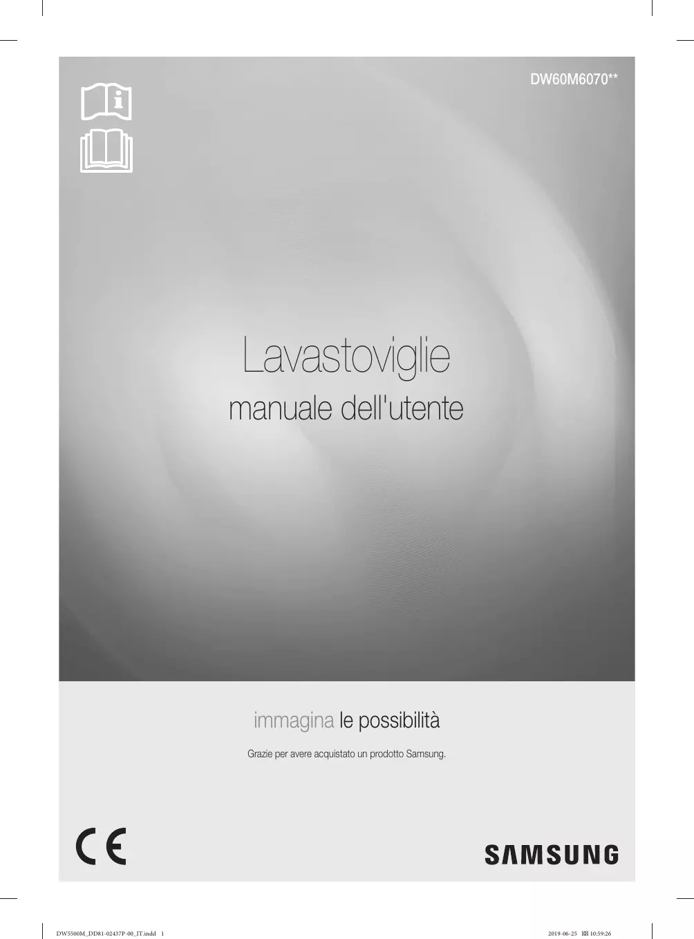 - (opłata według taryfy operatora) http://www.samsung.com/pl/support/ DD81-02437P-00 DW5500M_DD81-02437P-00_DE.indd 48 2019-06-25 10:56:57 DW60M6070** Lavastoviglie manuale dell'utente immagina le possibilità Grazie per avere acquistato un prodotto Samsung. DW5500M_DD81-02437P-00_IT.indd 1 2019-06-25 10:59:26 Istruzioni di sicurezza Congratulazioni per l'acquisto della tua nuova lavastoviglie Samsung. Questo manuale contiene importanti informazioni riguardanti l'installazione, l'uso e la manutenzione del tuo nuovo apparecchio. Ti consigliamo di leggere le informazioni qui fornite per conoscere i vantaggi offerti dalle funzioni della tua nuova lavastoviglie.