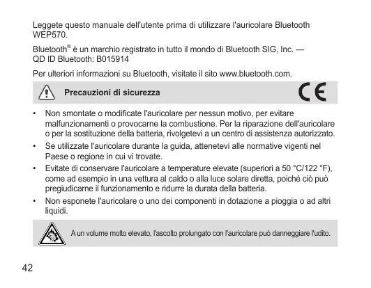 Leggete questo manuale dell'utente prima di utilizzare l'auricolare Bluetooth WEP570. Bluetooth® è un marchio registrato in tutto il mondo di Bluetooth SIG, Inc. — QD ID Bluetooth: B015914 Per ulteriori informazioni su Bluetooth, visitate il sito www.bluetooth.com. Precauzioni di sicurezza • • • •