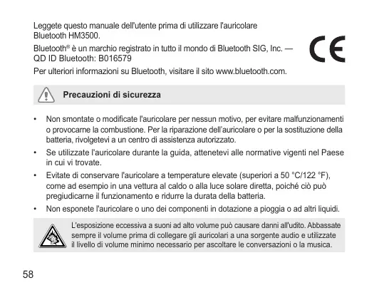 Leggete questo manuale dell'utente prima di utilizzare l'auricolare Bluetooth HM3500. Bluetooth® è un marchio registrato in tutto il mondo di Bluetooth SIG, Inc. — QD ID Bluetooth: B016579 Per ulteriori informazioni su Bluetooth, visitare il sito www.bluetooth.com. Precauzioni di sicurezza