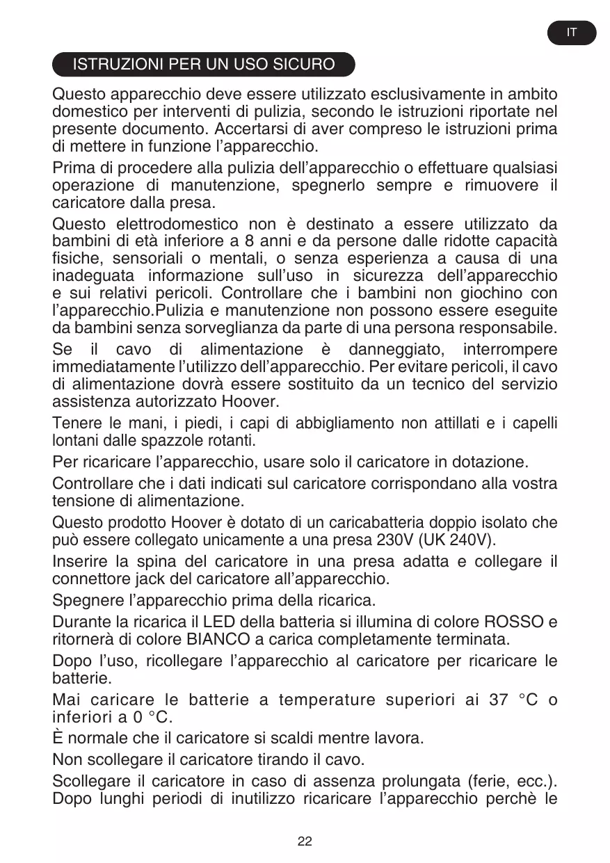 Le nettoyage et l’entretien ne devraient pas être effectués par des enfants sans supervision. Si le cordon d’alimentation est endommagé, arrêtez immédiatement d’utiliser l’appareil. Pour éviter les risques d’accident, un réparateur Hoover agréé doit remplacer le cordon d’alimentation. Maintenez les mains, pieds, vêtements et cheveux à distance des brosses rotatives. Utilisez uniquement le chargeur d’origine qui vous a été fourni avec l’appareil. Vérifiez que la tension de l’alimentation est la même que celle indiquée sur le chargeur. Cet appreil Hoover est fourni avec un chargeur de batterie doublement isolé qui n’est adapté qu’à une prise de 230 V (240 V Grande-Bretagne). Branchez le chargeur dans une prise adaptée et connectez la prise jack du chargeur dans l’appareil. Éteignez l’appareil avant de le charger. Le voyant LED du bloc batterie s’illumine en ROUGE lors de la charge et deviendra BLANC lorsque l’appareil est entièrement chargé. Rebranchez l’appareil au chargeur après l’utilisation pour recharger les batteries. Ne rechargez jamais les batteries dans des températures de plus de 37°C ou en-dessous de 0°C. Il est normal pour le chargeur de devenir chaud au toucher lorsqu’il est en train de charger. Ne pas débrancher en tirant sur le cordon d’alimentation. Débranchez le chargeur en cas d’absence prolongée (vacances, etc.). Rechargez l’appareil de nouveau avant de l’utiliser car les 8