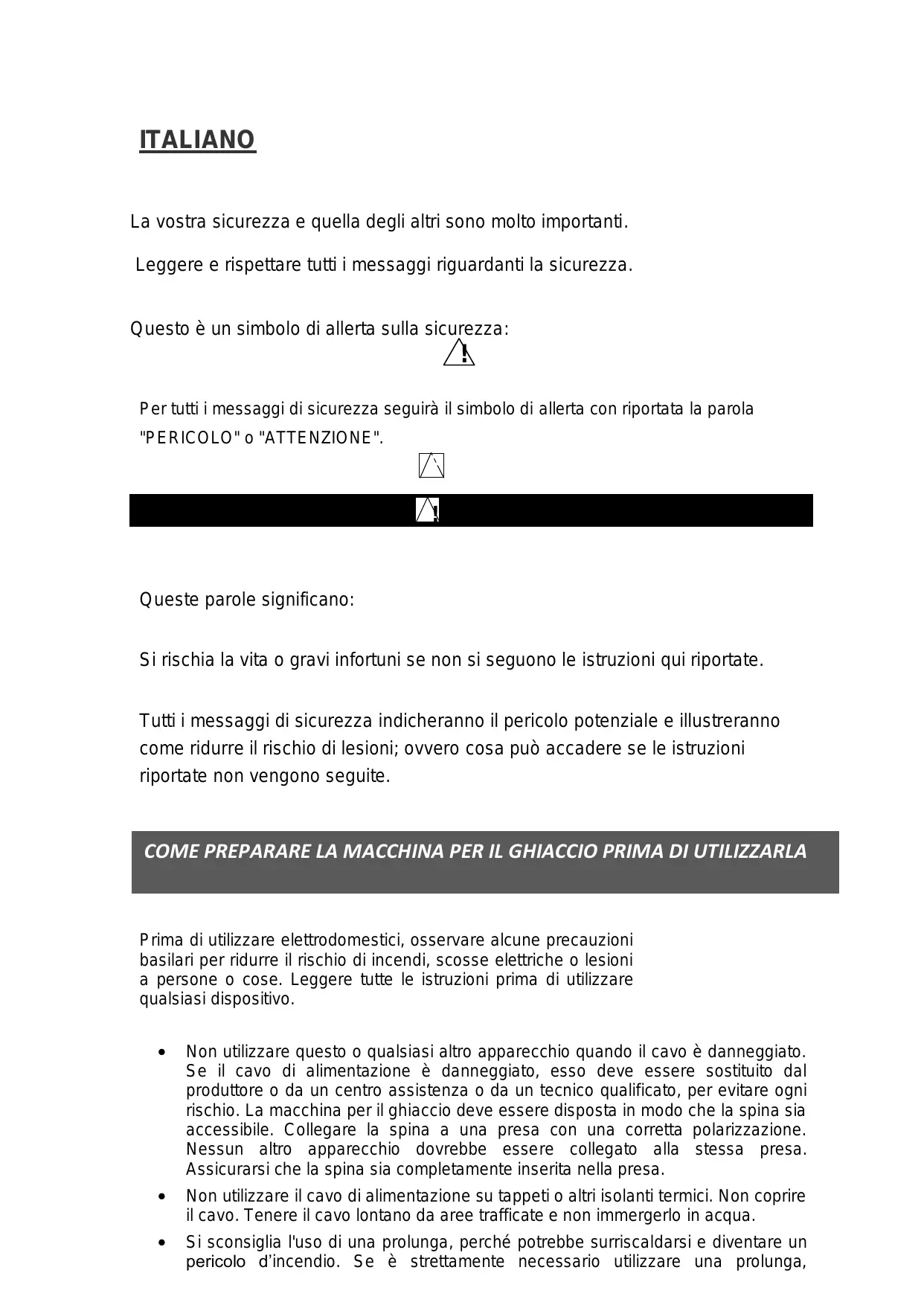 Per tutti i messaggi di sicurezza seguirà il simbolo di allerta con riportata la parola "PERICOLO" o "ATTENZIONE". PERICOLO ATTENZIONE Queste parole significano: Si rischia la vita o gravi infortuni se non si seguono le istruzioni qui riportate. Tutti i messaggi di sicurezza indicheranno il pericolo potenziale e illustreranno come ridurre il rischio di lesioni; ovvero cosa può accadere se le istruzioni riportate non vengono seguite. COME PREPARARE LA MACCHINA PER IL GHIACCIO PRIMA DI UTILIZZARLA Prima di utilizzare elettrodomestici, osservare alcune precauzioni basilari per ridurre il rischio di incendi, scosse elettriche o lesioni a persone o cose. Leggere tutte le istruzioni prima di utilizzare qualsiasi dispositivo. Non utilizzare questo o qualsiasi altro apparecchio quando il cavo è danneggiato. Se il cavo di alimentazione è danneggiato, esso deve essere sostituito dal produttore o da un centro assistenza o da un tecnico qualificato, per evitare ogni rischio. La macchina per il ghiaccio deve essere disposta in modo che la spina sia accessibile. Collegare la spina a una presa con una corretta polarizzazione. Nessun altro apparecchio dovrebbe essere collegato alla stessa presa. Assicurarsi che la spina sia completamente inserita nella presa. Non utilizzare il cavo di alimentazione su tappeti o altri isolanti termici. Non coprire il cavo. Tenere il cavo lontano da aree trafficate e non immergerlo in acqua. Si sconsiglia l'uso di una prolunga, perché potrebbe surriscaldarsi e diventare un pericolo d’incendio. Se è strettamente necessario utilizzare una prolunga, scegliere la dimensione minima n° 0.75mm2 calibrata almeno a 16A/250 V ~ con tappo. Scollegare la spina prima di eseguire qualsiasi operazione di manutenzione o riparazione. Prestare particolare attenzione quando si utilizza l’apparecchio alla presenza di bambini. Non utilizzare la macchina per il ghiaccio in ambienti esterni. Disporla lontano dalla luce diretta del sole e assicurarsi che ci siano almeno 10 mm di spazio tra la parte posteriore dell’apparecchio e la parete. Mantenere una distanza minima di 10 mm su ciascun lato della macchina. Non utilizzare alcun liquido diverso dall'acqua. Non pulire la macchina per il ghiaccio con liquidi infiammabili poiché i vapori potrebbero creare un pericolo d’incendio o esplosione. Non rovesciare l’apparecchio. Se l’apparecchio viene collocato in ambienti molto freddi, lasciare qualche ora per raggiungere la temperatura ambiente prima di collegare la spina. Questo dispositivo non è destinato all'uso da parte di persone con capacità fisiche, mentali o sensoriali ridotte, o da persone con scarsa conoscenza (inclusi i bambini), salvo che una persona responsabile della loro sicurezza non abbia fornito loro le dovute indicazioni. Sorvegliare sempre i bambini in prossimità dell’apparecchio per accertarsi che non giochino. Si prega gentilmente, in conformità alle normative vigenti riguardanti lo smaltimento dei rifiuti con gas infiammabili, di rimuovere quelle parti dell’apparecchio che potrebbero rappresentare un rischio per i bambini. ATTENZIONE: Questo apparecchio deve essere collegato a una presa con messa a terra. IMPORTANTE: I fili del cavo di alimentazione sono colorati in base al seguente codice: Verde (o verde con striscia gialla): messa a terra Blu: Neutro Marrone: Fase 1 Per evitare rischi dovuti all'instabilità del dispositivo, è opportuno disporre la macchina su una superficie piatta o piana.