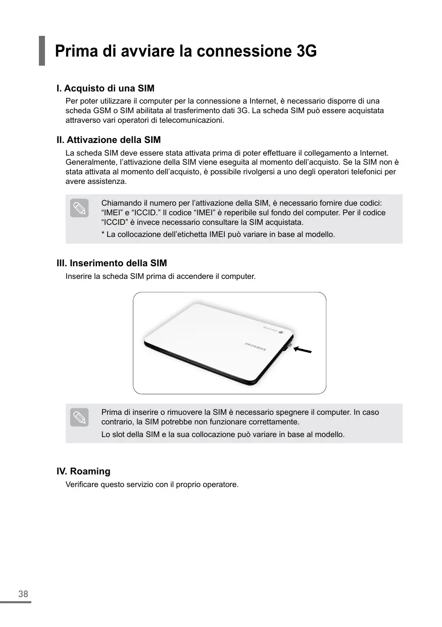Precauzioni di sicurezza Seguire tutte le avvertenze e le normative sulla sicurezza Rispettare tutte le normative che limitano l’uso del PC con porta WAN wireless integrata in determinate aree. Precauzioni d’uso durante le connessioni 3G: Mantenere una distanza di sicurezza dal ventre di donne in gravidanza o dal basso ventre di minori. Evitare interferenze con i pacemaker Mantenere una distanza minima di 15 cm tra il PC con porta WAN wireless integrata e il pacemaker per evitare potenziali interferenze, così come raccomandato dai costruttori e dai gruppi di ricerca indipendenti quali il Wireless Technology Research. Se per qualsiasi motivo si sospetta che il proprio PC con porta WAN wireless integrata interferisca con un pacemaker o con altri dispositivi medicali, spegnere il PC immediatamente e contattare il costruttore del pacemaker o del dispositivo medicale per ottenere assistenza. Spegnere il PC con porta WAN wireless integrata in ambienti potenzialmente esplosivi Non utilizzare il PC con porta WAN wireless integrata presso punti di rifornimento carburante (stazioni di servizio) o depositi di carburante o sostanze chimiche. Spegnere il PC con porta WAN wireless integrata laddove segnalato da avvertenze o indicazioni specifiche. Il PC con porta WAN wireless integrata può causare esplosione o incendio all’interno e nei pressi di depositi di carburante o sostanze chimiche e nelle aree di trasferimento o di esplosione. Non conservare o trasportare liquidi infiammabili, gas o materiali esplosivi nello stesso contenitore del PC con porta WAN wireless integrata, di sue parti o accessori. Usare solo accessori approvati da Samsung L’uso di accessori non compatibili può danneggiare il PC con porta WAN wireless integrata o causare lesioni personali. Spegnere il PC con porta WAN wireless integrata nelle vicinanze di apparecchiature medicali Il PC con porta WAN wireless integrata può generare interferenze con le apparecchiature medicali situate all’interno di ospedali o strutture sanitarie. Spegnere il PC con porta WAN wireless integrata e seguire le normative delle linee aeree all’interno dei velivoli Il PC con porta WAN wireless integrata può generare interferenze con le apparecchiature del velivolo. Seguire tutte le normative delle compagnie aeree e spegnere il PC con porta WAN wireless integrata quando richiesto.