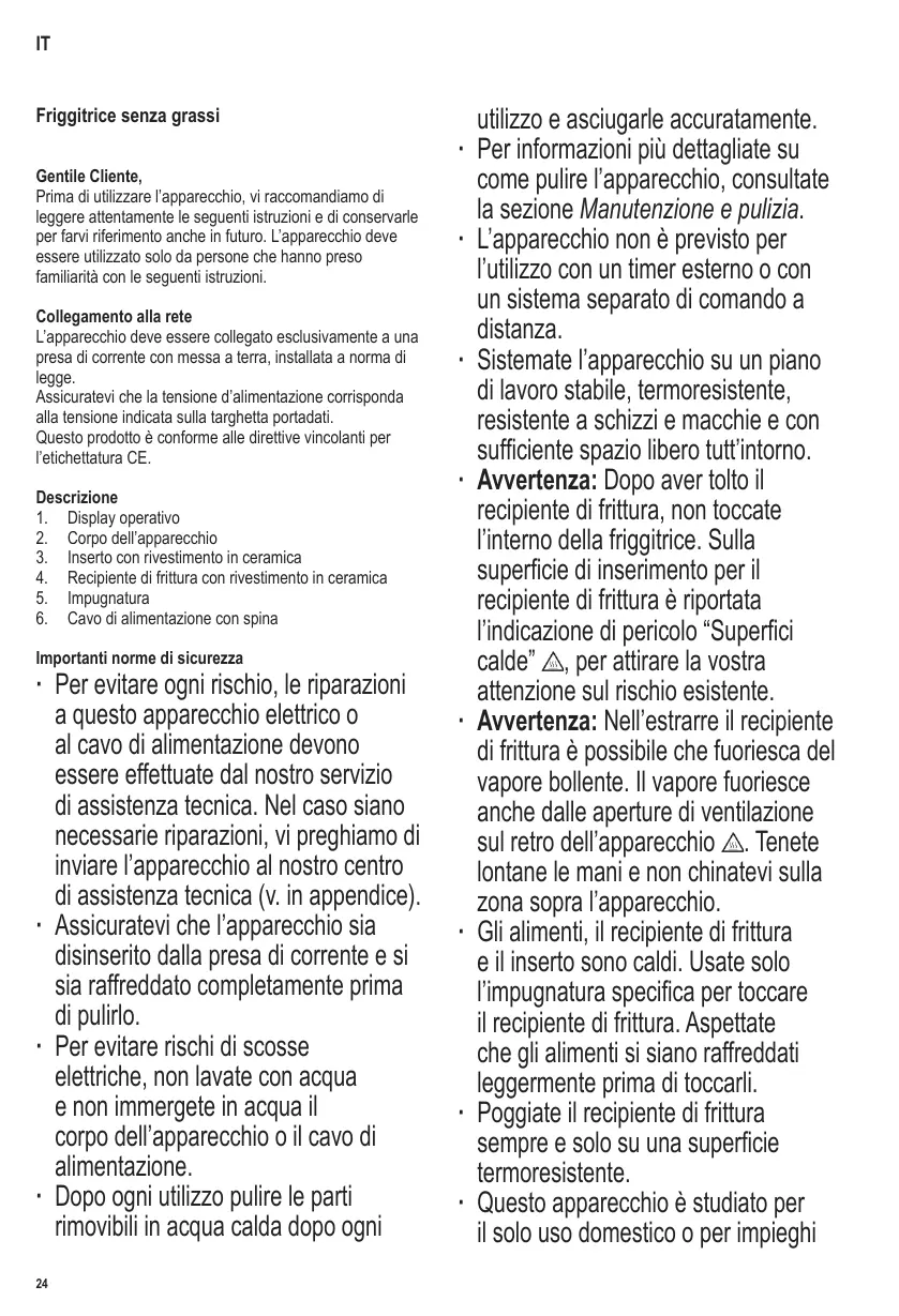∙ Le temps de cuisson augmente lorsqu’il s’agit de plus larges quantités. Nous vous conseillons de retourner fréquemment les aliments. ∙ Si les aliments sont trop cuits, choisissez d’abord la température basse avant de réduire le temps de cuisson. ∙ Pour une friture nutritive et saine, nous recommandons d’utiliser une température ne dépassant pas 170 °C pour les aliments amylacés, c’est-à-dire les aliments contenant une quantité d’amidon supérieure à la moyenne. Une température de friture moindre, combinée à une quantité d’aliments également réduite, limite au minimum la formation de substances nuisibles à la santé. Entretien et nettoyage ∙ Avant de nettoyer la friteuse, débranchez toujours la fiche de la prise de courant et laissez l’appareil refroidir suffisamment. ∙ Avertissement : Pour éviter tout risque de choc électrique, ne pas nettoyer l’extérieur de l’appareil ou son cordon d’alimentation avec un liquide quelconque ni les immerger dans l’eau. ∙ Pour éviter de rayer le revêtement céramique du panier et de la cuve à friture, ne pas utiliser de produits abrasifs ou des produits nettoyant concentrés. ∙ Le panier et la cuve doivent être nettoyés à l’eau chaude savonneuse. Essuyez ensuite soigneusement. ∙ Attention : Aucune pièce n’est lavable au lavevaisselle. ∙ L’extérieur du boitier et la surface d’insertion dans la cuve peuvent être nettoyés avec un chiffon humide nonpelucheux.