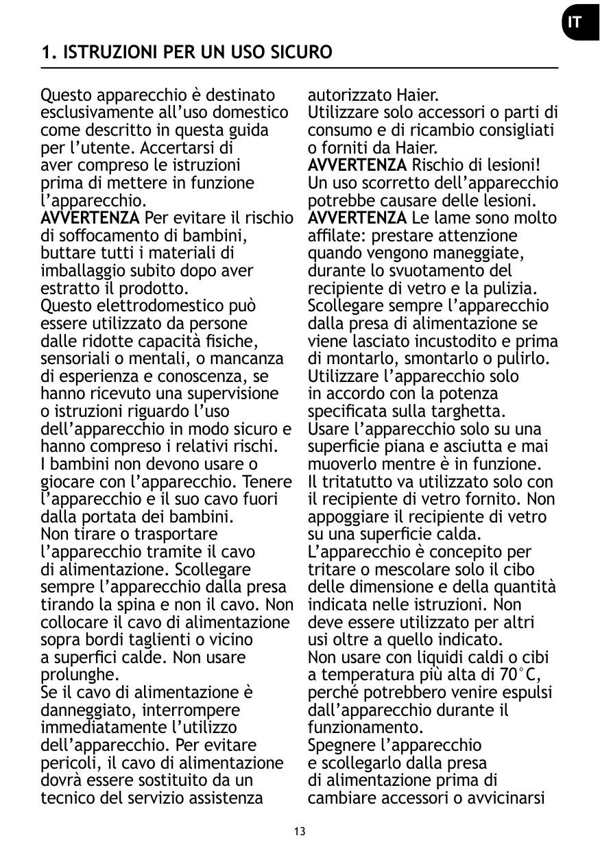 N’utilisez pas l’appareil avec des mains mouillées. Faites attention à la propreté des surfaces destinées à entrer en contact avec les aliments ! Veuillez tenir compte des informations sur le nettoyage dans les instructions. Ne continuez pas à utiliser votre appareil s’il semble défectueux. Haier service : Pour assurer l’utilisation sûre et efficace de cet appareil, nous recommandons de n’en confier l’entretien ou les réparations qu’à un réparateur Haier agréé. AVERTISSEMENT Ne surchargez pas le hacheur. Si vous mettez de la nourriture collante dans le hacheur, n’excédez pas la quantité (max 150 g de beurre + 300 g de miel) et utilisez au maximum pendant 3 secondes avec 2 minutes de pause pendant 3 cycles.