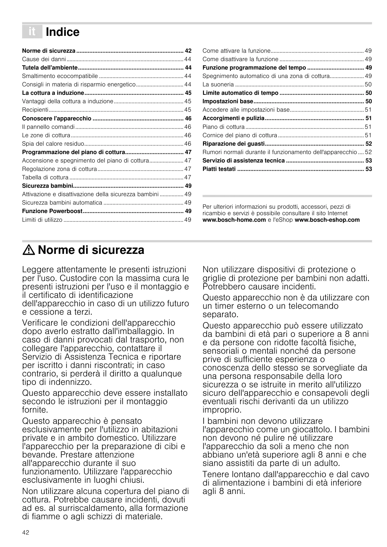 - Piatti testati Produktinfo Per ulteriori informazioni su prodotti, accessori, pezzi di ricambio e servizi è possibile consultare il sito Internet www.bosch-home.com e l'eShop www.bosch-eshop.com : Norme di sicurezza Leggere attentamente le presenti istruzioni per l'uso. Custodire con la massima cura le presenti istruzioni per l'uso e il montaggio e il certificato di identificazione dell'apparecchio in caso di un utilizzo futuro e cessione a terzi. Verificare le condizioni dell'apparecchio dopo averlo estratto dall'imballaggio. In caso di danni provocati dal trasporto, non collegare l'apparecchio, contattare il Servizio di Assistenza Tecnica e riportare per iscritto i danni riscontrati; in caso contrario, si perderà il diritto a qualunque tipo di indennizzo. Questo apparecchio deve essere installato secondo le istruzioni per il montaggio fornite. Questo apparecchio è pensato esclusivamente per l'utilizzo in abitazioni private e in ambito domestico. Utilizzare l'apparecchio per la preparazione di cibi e bevande. Prestare attenzione all'apparecchio durante il suo funzionamento. Utilizzare l'apparecchio esclusivamente in luoghi chiusi. Non utilizzare alcuna copertura del piano di cottura. Potrebbe causare incidenti, dovuti ad es. al surriscaldamento, alla formazione di fiamme o agli schizzi di materiale. p. 53
