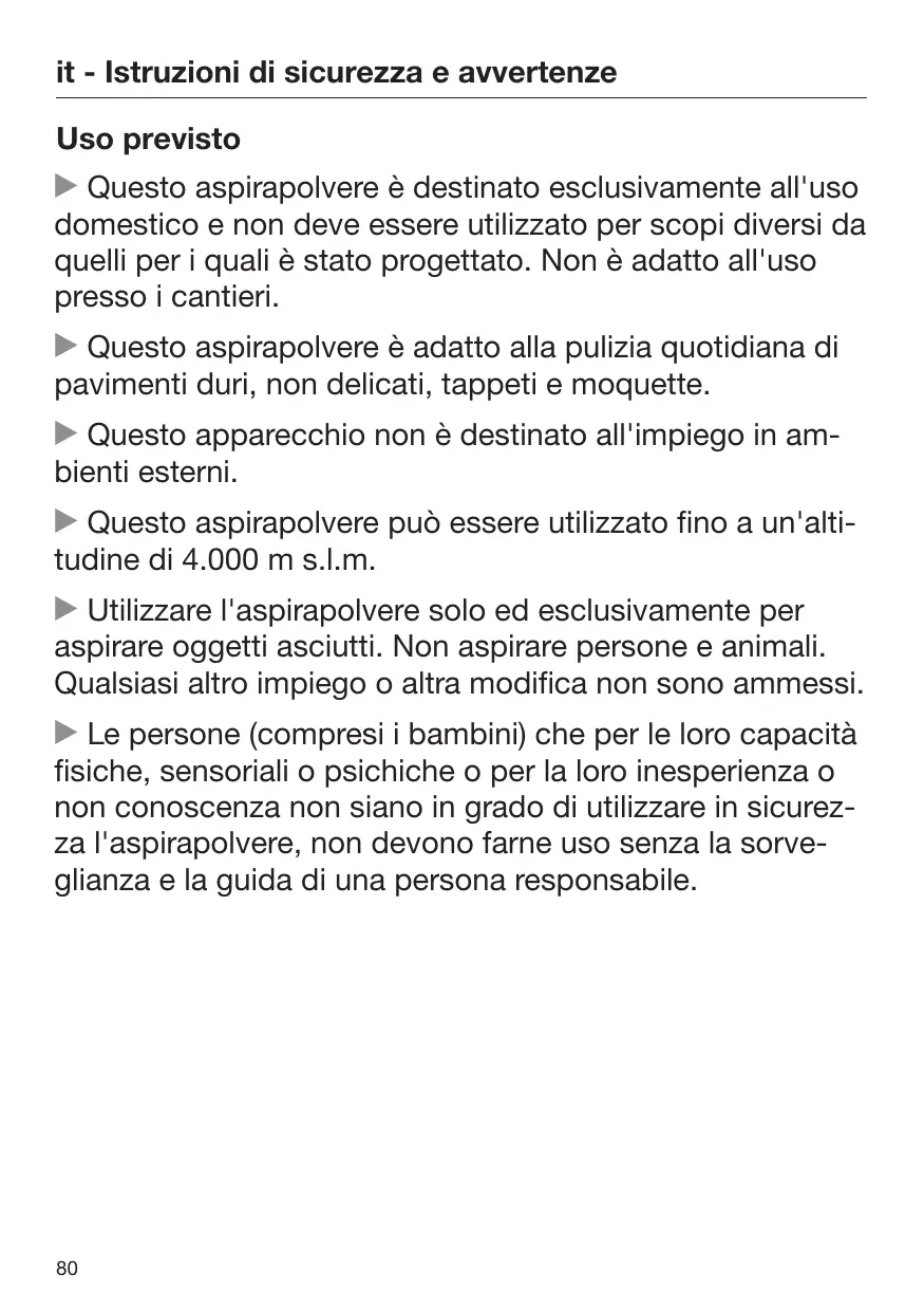 Cet aspirateur ne doit pas être utilisé en extérieur. Cet aspirateur est conçu pour une utilisation jusqu'à 4000 m d'altitude au-dessus du niveau de la mer. N'utilisez l'aspirateur que dans le cadre domestique, pour aspirer des poussières sèches. N'utilisez pas cet aspirateur sur les hommes et les animaux. Toute autre application, adaptation ou modification de l'aspirateur est interdite. Les personnes (y compris les enfants) qui ne sont pas en mesure d'utiliser l'aspirateur en toute sécurité en raison de déficiences physiques, sensorielles ou mentales, de leur inexpérience ou de leur ignorance ne doivent pas utiliser l'aspirateur sans la surveillance ou les instructions d'une personne responsable.