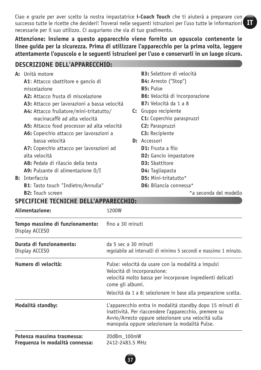 2412-2483.5 MHz Avant d’utiliser votre appareil pour la première fois, nettoyez toutes les pièces avec de l’eau savonneuse sauf le bloc moteur (voir partie « Nettoyage »). Nous vous recommandons de laver les accessoires (D1), (D2) et (D3) au lave-vaisselle au moins une fois. Rincez et séchez. Les accessoires sont emballés dans des sacs non-tissés que vous pourrez réutiliser en housse de rangement. ​ Placez votre appareil sur une surface plate, propre et sèche en vous assurant que le bouton de vitesses (B7) est en position «Stop» (B4). Appuyez sur le bouton O/I (A9) pour démarrer votre appareil. Ne le déplacez jamais en le portant par un accessoire fixé sur le haut (par exemple, le mini—hachoir).