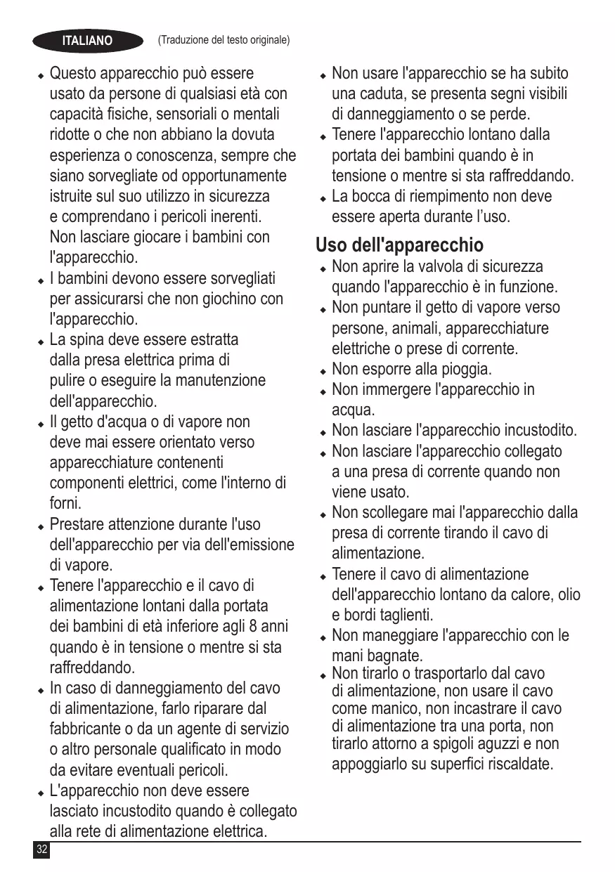 Questo apparecchio può essere usato da persone di qualsiasi età con capacità fisiche, sensoriali o mentali ridotte o che non abbiano la dovuta esperienza o conoscenza, sempre che siano sorvegliate od opportunamente istruite sul suo utilizzo in sicurezza e comprendano i pericoli inerenti. Non lasciare giocare i bambini con l'apparecchio. u I bambini devono essere sorvegliati per assicurarsi che non giochino con l'apparecchio. u La spina deve essere estratta dalla presa elettrica prima di pulire o eseguire la manutenzione dell'apparecchio. u Il getto d'acqua o di vapore non deve mai essere orientato verso apparecchiature contenenti componenti elettrici, come l'interno di forni. u Prestare attenzione durante l'uso dell'apparecchio per via dell'emissione di vapore. u Tenere l'apparecchio e il cavo di alimentazione lontani dalla portata dei bambini di età inferiore agli 8 anni quando è in tensione o mentre si sta raffreddando. u In caso di danneggiamento del cavo di alimentazione, farlo riparare dal fabbricante o da un agente di servizio o altro personale qualificato in modo da evitare eventuali pericoli. u L'apparecchio non deve essere lasciato incustodito quando è collegato alla rete di alimentazione elettrica. u