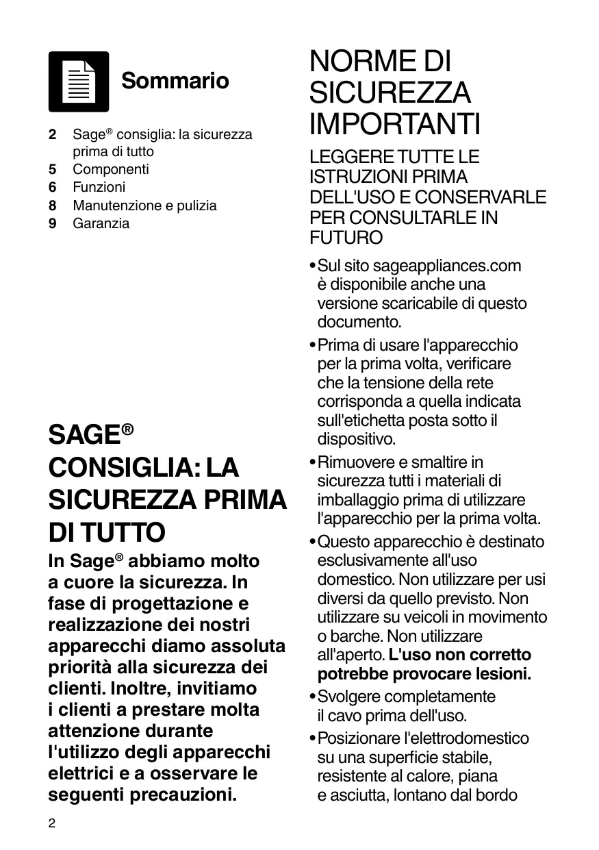 In Sage® abbiamo molto a cuore la sicurezza. In fase di progettazione e realizzazione dei nostri apparecchi diamono assoluta priorità alla sicurezza dei clienti. Inoltre, INVitiamo i clienti a prestare molta attenzione durante l'utilizzo degli apparecchi elettrici e a osservare le seguenti precauzioni.