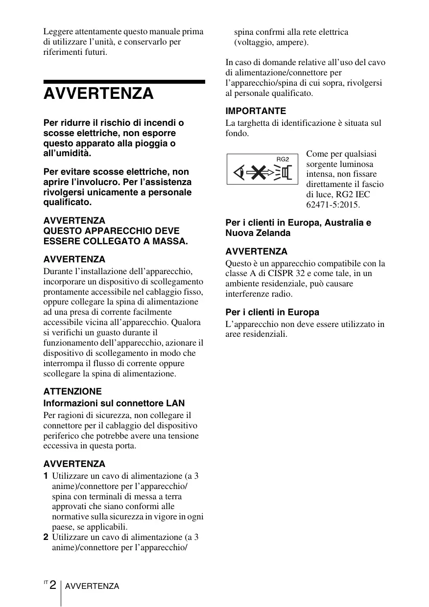 Cet appareil numérique de la classe A est conforme à la norme NMB-003 du Canada. Pour les clients en Europe, Australie et Nouvelle-Zélande AVERTISSEMENT Cet appareil est conforme à la Classe A de CISPR 32. Dans un environnement domestique, cet appareil peut provoquer des interférences radio. Pour les clients en Europe Ne pas utiliser cet appareil dans une zone résidentielle. Pour les clients au Canada GARANTIE LIMITÉE DE SONY Rendez-vous sur http://www.sonybiz.ca/ pro/lang/en/ca/article/resources-warranty pour obtenir les informations importantes et l’ensemble des termes et conditions de la garantie limitée de Sony applicable à ce produit.