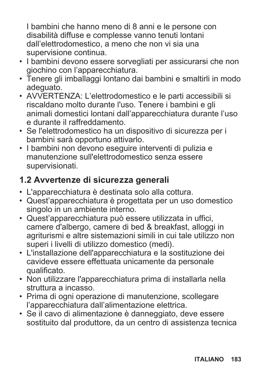 • Cet appareil est exclusivement destiné à un usage culinaire. • Cet appareil est conçu pour un usage domestique unique, dans un environnement intérieur. • Cet appareil peut être utilisé dans les bureaux, les chambres d’hôtel, les chambres d’hôtes, les maisons d’hôtes de ferme et d’autres hébergements similaires lorsque cette utilisation ne dépasse pas le niveau (moyen) de l’utilisation domestique. • Cet appareil doit être installé et le câble remplacé uniquement par un professionnel qualifié. • N'utilisez pas l'appareil avant de l'avoir installé dans la structure encastrée. • Débranchez l'appareil de l'alimentation électrique avant toute opération d'entretien. • Si le cordon d'alimentation est endommagé, il doit être remplacé par le fabricant, son service après-vente agréé ou FRANÇAIS