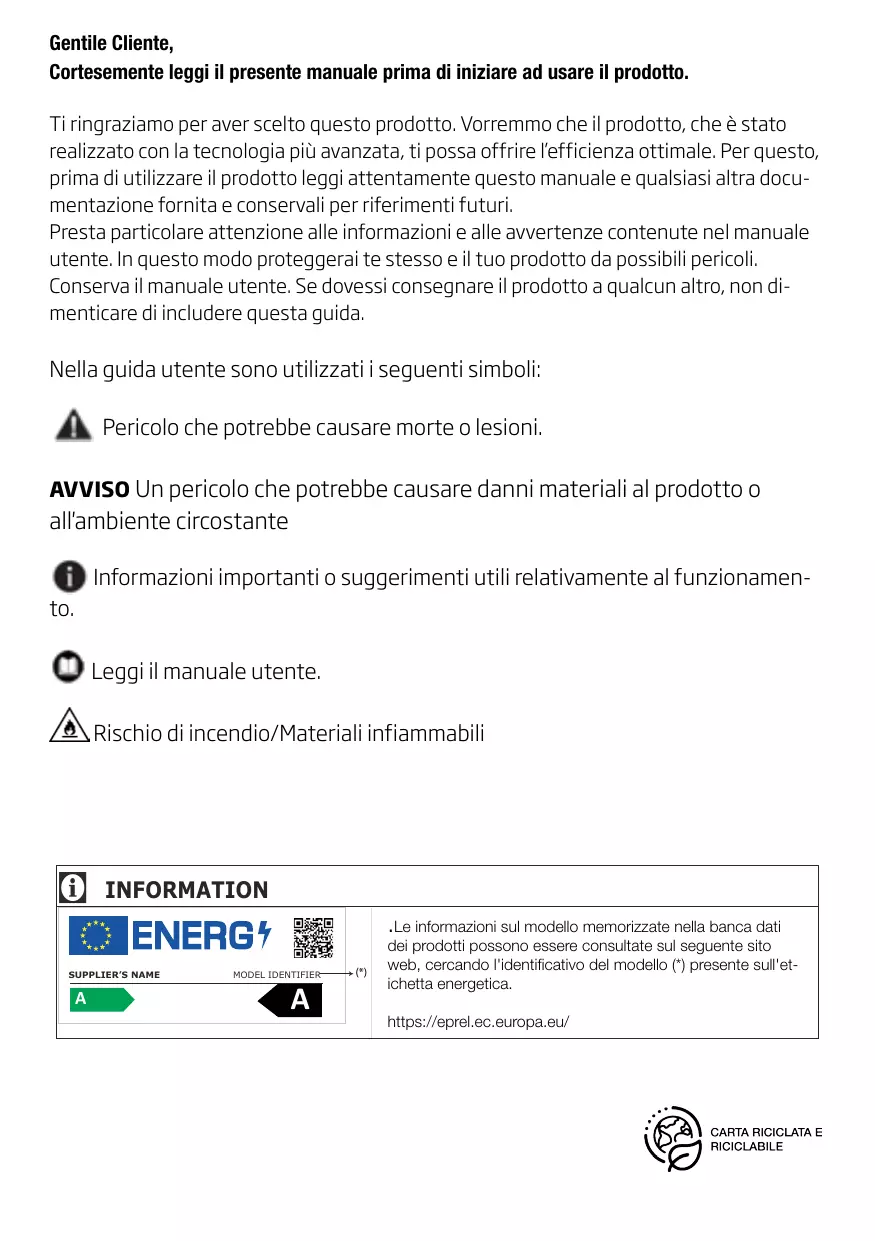 Lisez le manuel d'utilisation. Risque d’incendie/matériaux inflammables