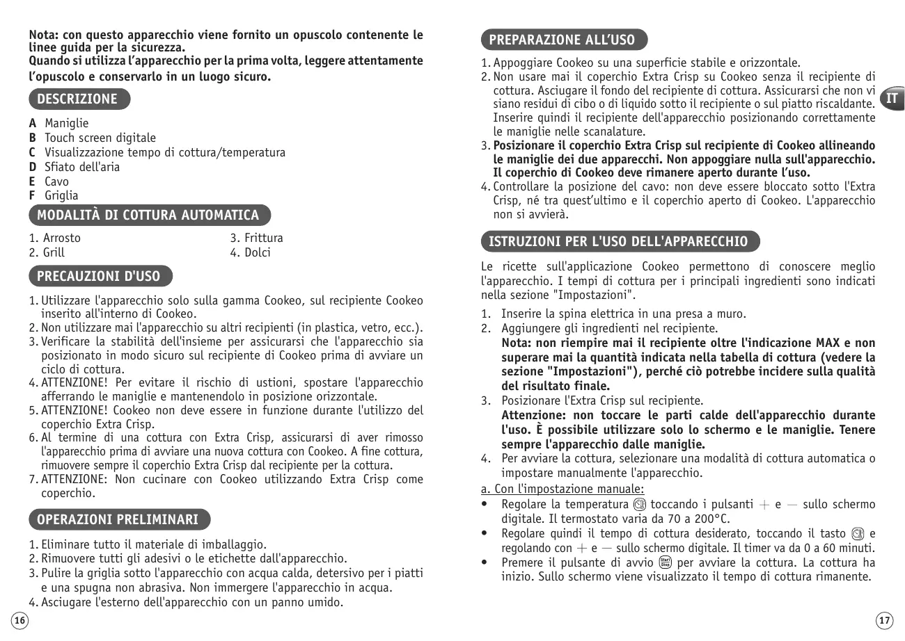 2. Never use the Extra Crisp lid on your Cookeo without the cooking pot. Wipe the base of the cooking pot. Make sure that there is no food residue or liquid under the bowl or on the heating plate. Then fit the appliance pot by positioning the handles of the pot into the slots. 3. Position the Extra Crisp onto the Cookeo pot by aligning the handles of the two appliances. Do not place anything on top of the appliance. The lid of your Cookeo needs to remain open during use. «Ajustes»), ya que podría afectar a la calidad del resultado final. 3. Coloca el Extra Crisp sobre la cubeta. Atención: No toques las partes calientes del aparato mientras esté en marcha. Evita cualquier otro tipo de contacto que no sea utilizar la pantalla o agarrar los tiradores. Coge siempre el aparato por los tiradores. 4. Para iniciar la cocción puedes seleccionar un modo de cocción automática o configurar el aparato manualmente. a. Si optas por una configuración manual: • Configura la temperatura mediante los botones y de la pantalla digital. El termostato admite temperaturas entre los 70 y los 200°C. • Luego selecciona el tiempo de cocción deseado mediante el control táctil y los botones y de la pantalla digital. El temporizador admite periodos de entre 0 y 60 minutos. • Pulsa el botón de puesta en marcha para iniciar la cocción. Una vez hecho esto, la cocción dará comienzo. El tiempo de cocción restante se mostrará en la pantalla. 23