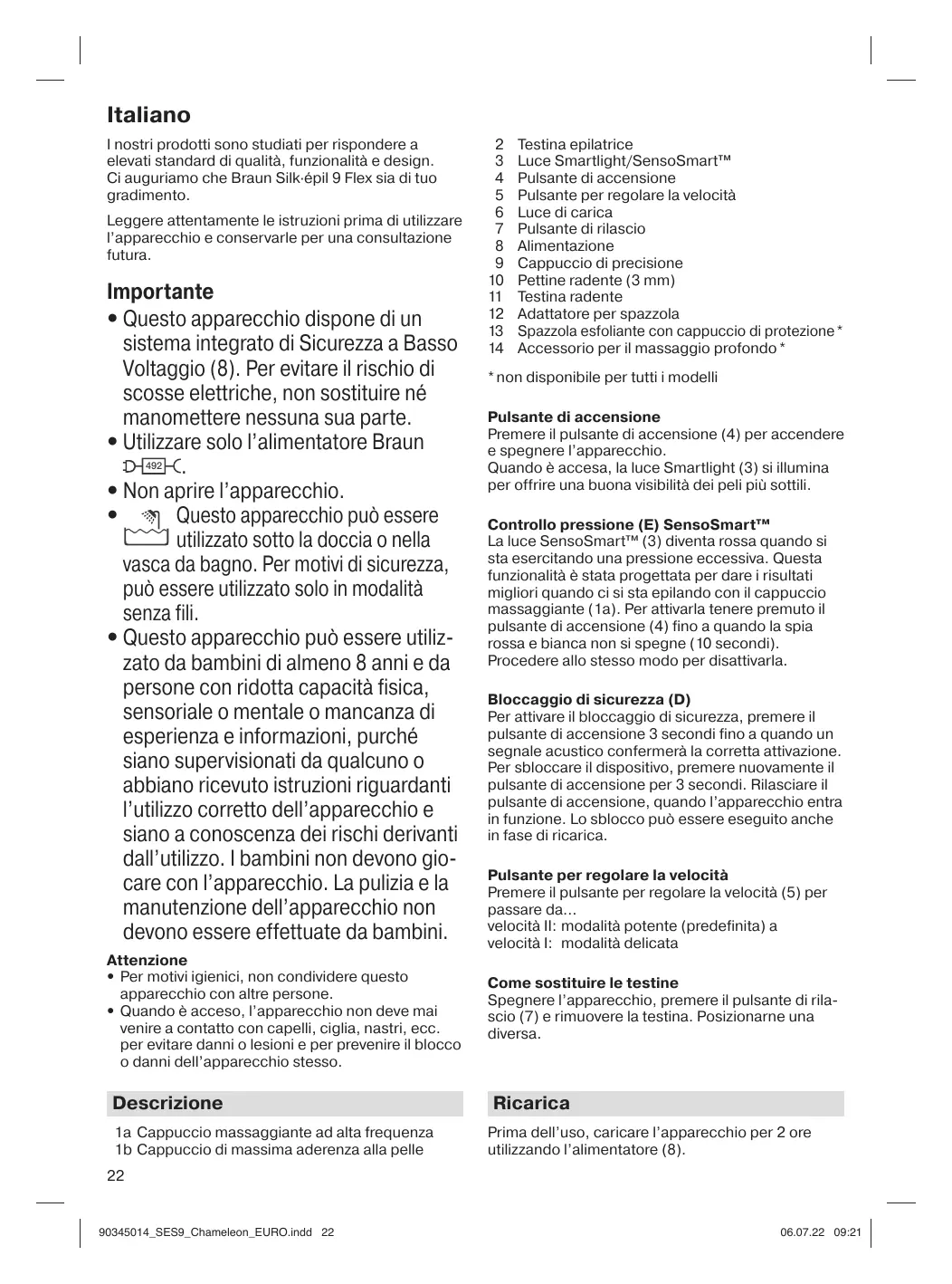 Italiano I nostri prodotti sono studiati per rispondere a elevati standard di qualità, funzionalità e design. Ci auguriamo che Braun Silk·épil 9 Flex sia di tuo gradimento. Leggere attentamente le istruzioni prima di utilizzare l’apparecchio e conservarle per una consultazione futura.