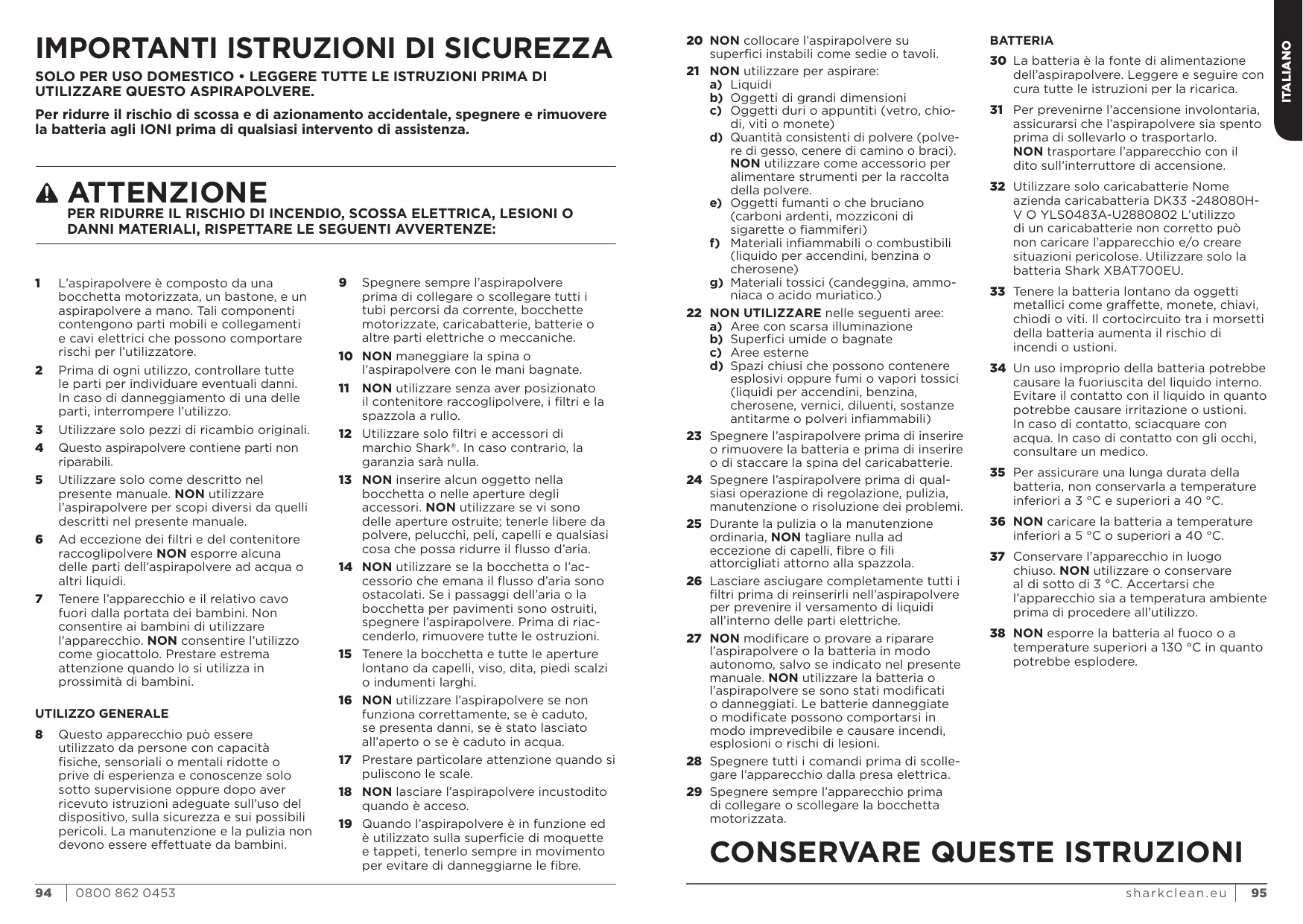 - Ti chiediamo di conservare sempre il relativo scontrino fiscale. Qualora dovessi far valere la Garanzia convenzionale, avremo bisogno dello scontrino fiscale per verificare che le infor-mazioni che ci hai fornito siano corrette. Qualora tu non sia in grado di fornirci uno scontri-no fiscale valido, la garanzia non sarà valida. Quali sono i vantaggi della registrazione della garanzia del produttore per la batteria? Al momento della registrazione della Garanzia convenzionale, riceveremo i tuoi dati che uti-lizzeremo nel caso dovessimo avere necessità di contattarti. Puoi inoltre ricevere suggeri-menti e consigli su come sfruttare tutte le potenzialità del tuo aspirapolvere Shark e cono-scere le ultime notizie sulle nuove tecnologie e i lanci di nuovi Prodotti Shark. Se registri la tua Garanzia convenzionale online, riceverai una conferma immediata che abbiamo ricevu-to i tuoi dati. Per quanto tempo sono garantite le batterie agli ioni di litio nell’ambito della garanzia fornita dal produttore per la batteria? Grazie alla fiducia che riponiamo nella nostra progettazione e nel nostro controllo qualità, la batteria contenuta negli aspirapolvere Shark nuovi è garantita per un totale di 2 anni. Che cosa copre la Garanzia convenzionale per la batteria? 1. La riparazione o la sostituzione (a discrezione di Shark) della tua batteria agli ioni di litio ori-ginale, incluse le spese di trasporto e di spedizione, per 2 anni dalla data di acquisto origi-nale. 2. Nella rara evenienza di una sostituzione della batteria, la garanzia coprirà la batteria di ricambio per sei mesi dalla data di ricezione della stessa o per la restante validità della garanzia originale, se superiore ai sei mesi. Che cosa non copre la Garanzia convenzionale per la batteria? 1. La normale usura della batteria agli ioni di litio, utilizzata nell’intervallo di temperatura indica-to nell’apposita sezione dedicata alle istruzioni di sicurezza.
