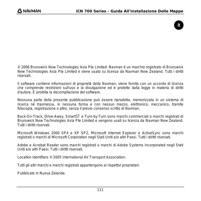 Smart5 Desktop es una aplicación de software para ordenador que se emplea para instalar mapas en el iCN. También puede utilizarlo para: Instalación de mapas nuevos Para instalar mapas nuevos en el iCN, siga estos pasos: 1. Il est interdit de reproduire, de mémoriser dans un système de recherche d'information ou de transmettre sous quelque format ou de quelque manière que ce soit, que ce soit par un procédé électronique ou mécanique, au moyen de photocopies, d'enregistrement ou de tout autre moyen, le présent document en tout ou en partie, sans l'accord écrit et préalable de Navman. Back-On-Track, Drive-Away, Smart5 et Turn-by-Turn sont des marques déposées ou des marques commerciales de Brunswick New Technologies Asia Pte Limited et sont utilisées sous licence par Navman New Zealand. Tous droits réservés. Microsoft Windows 2000 SP4 et SP XP2, Microsoft Internet Explorer et ActiveSync sont des marques déposées ou commerciales de Microsoft Corporation aux Etats-Unis et/ou dans d'autres pays. Tous droits réservés. Adobe et Acrobat Reader sont des marques déposées ou des marques commerciales de Adobe Systems Incorporated aux États-Unis et/ou dans d'autres pays. Tous droits réservés. Location Identifiers © 2005 International Air Transport Association. Toutes les autres marques déposées et inscriptions sont la propriété de leurs propriétaires respectifs. Publié en Nouvelle-Zélande.
